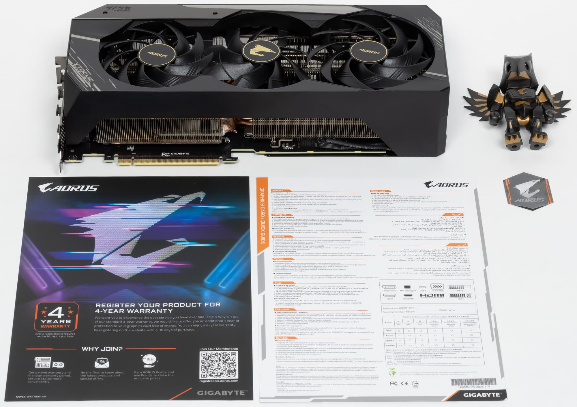 Комплект поставки, кроме традиционного руководства пользователя, включает регистрационную карточку для получения 4-летней гарантии, фирменный стикер Aorus и... собственно, Chibi.