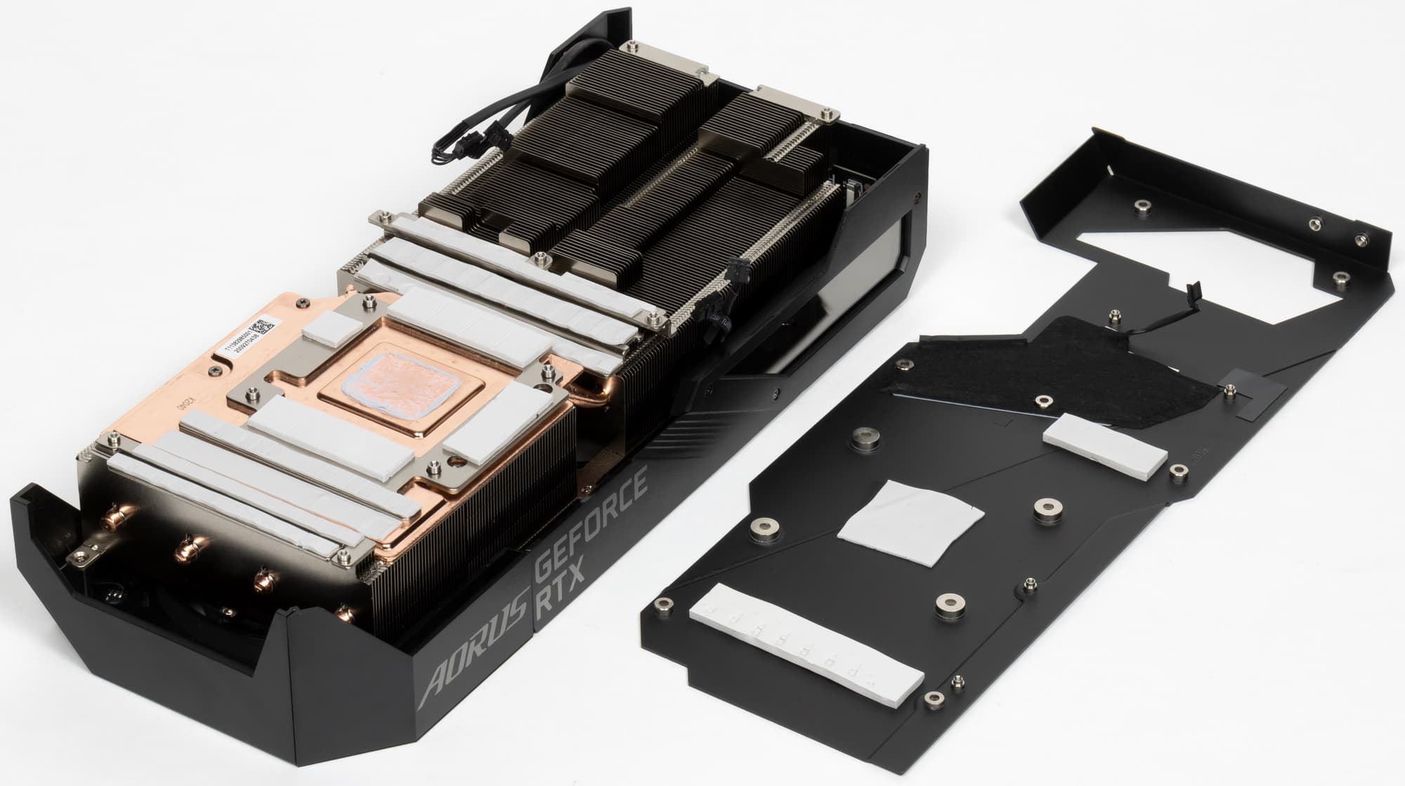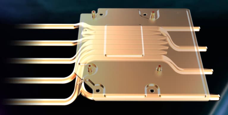 Система охлаждения очень сложная. Ее основой является огромный пластинчатый никелированный радиатор с тепловыми трубками, но последние припаяны не к просто медной подошве на GPU, а к испарительной камере, которая уже напрямую контактирует с GPU.