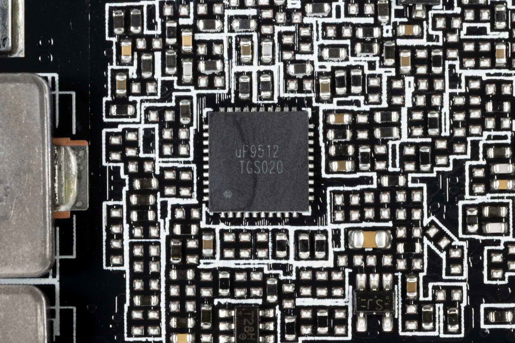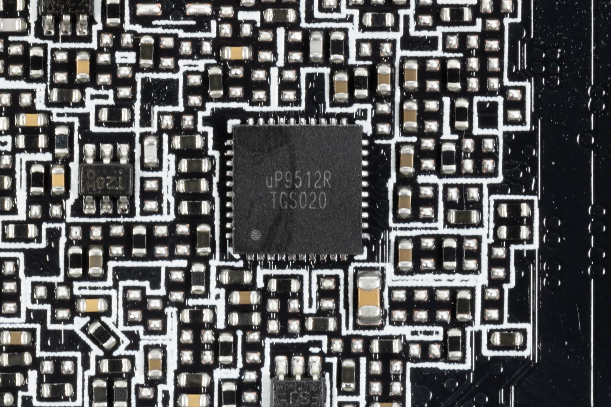 На лицевой же стороне имеется другой ШИМ-контроллер uPI Semiconductor uP9512, который управляет 4-фазной схемой питания микросхем памяти.
