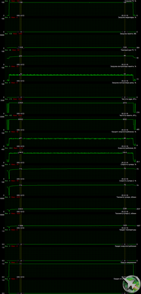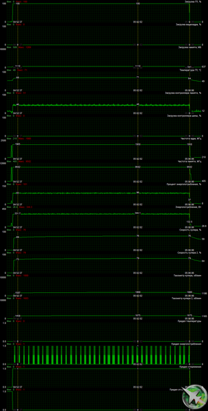 После 6-часового прогона под нагрузкой максимальная температура ядра не превысила 66 градусов, что является отличным результатом для видеокарт флагманского уровня. Энергопотребление карты доходило до 347 Вт. Правда, кулер при этом сильно шумел.