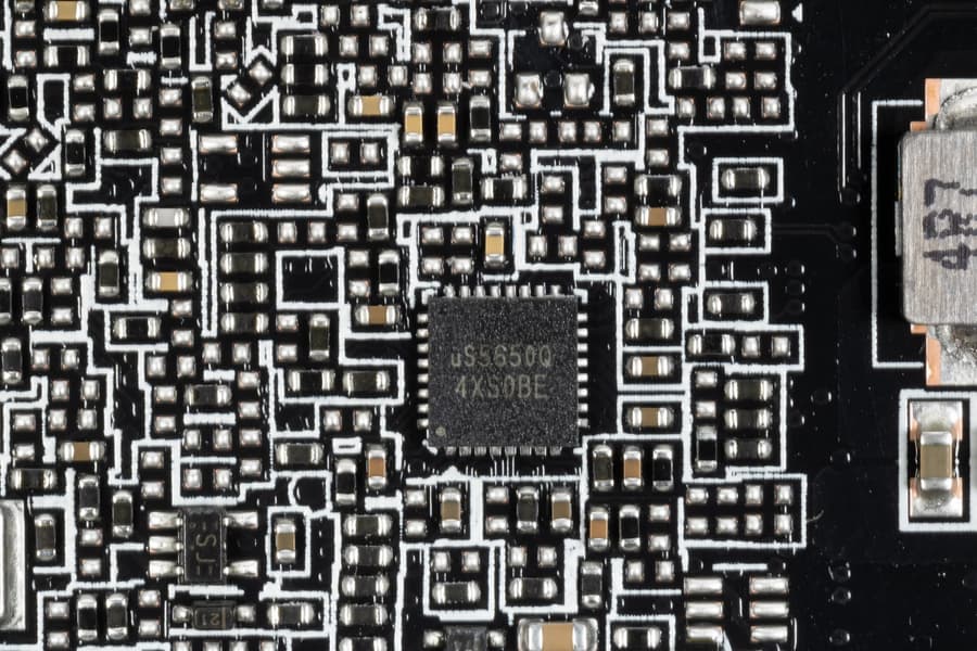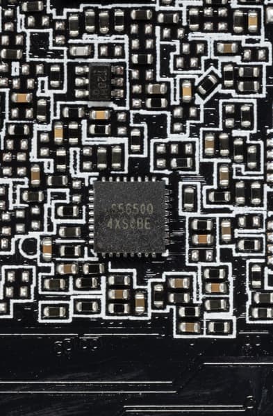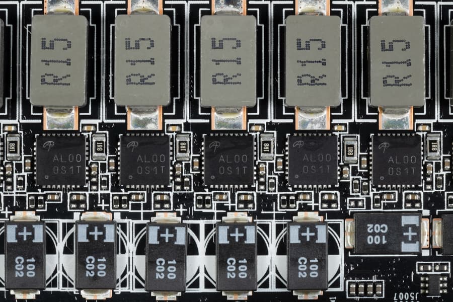 В преобразователе питания, традиционно для всех видеокарт Nvidia, используются транзисторные сборки DrMOS — в данном случае AOZ5332QI (Alpha & Omega Semiconductor), каждая из которых рассчитана максимум на 50 А.