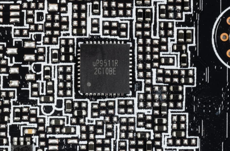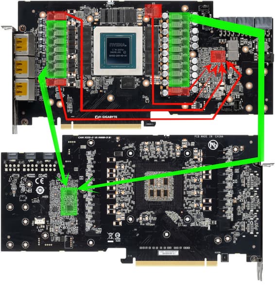 Зеленым цветом отмечена схема питания ядра, красным — памяти. При этом никаких удвоителей (даблеров) фаз нет, для управления схемой питания GPU используются два ШИМ-контроллера uP9511R и uP9512R (uPI Semiconductor), каждый из которых способен управлять 8 фазами максимум (реализовано 8+8). Оба расположены на оборотной стороне платы.