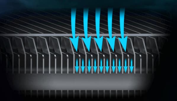 Сетка из ребер радиатора имеют характерную структуру со срезанными углами наборных пластин в сочетании с разной высотой ребер, что помогает сформировать хорошо направленный воздушный поток и оптимизировать площадь поверхности теплоотвода.