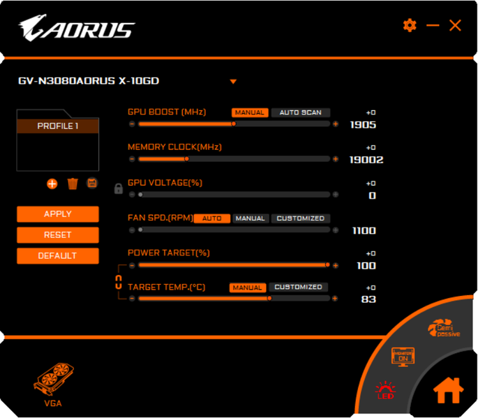 Управление работой карты обеспечивается силами фирменной утилиты Aorus Engine. Кстати, стоит упомянуть, что я попробовал ручной разгон и после экспериментов вышел на стабильную работу при увеличении частоты ядра на 125 МГц, а памяти — на 755 МГц. Получил при этом максимум по частотам 2130/20500 МГц и прирост производительности в среднем на 5% (в разрешении 4К — более +8% относительно референс-значений). При этом максимум энергопотребления составил уже 365 Вт.