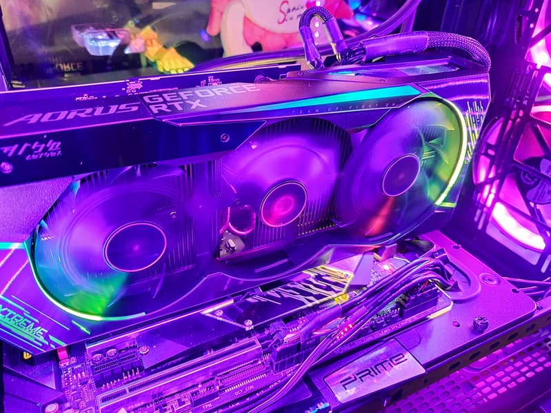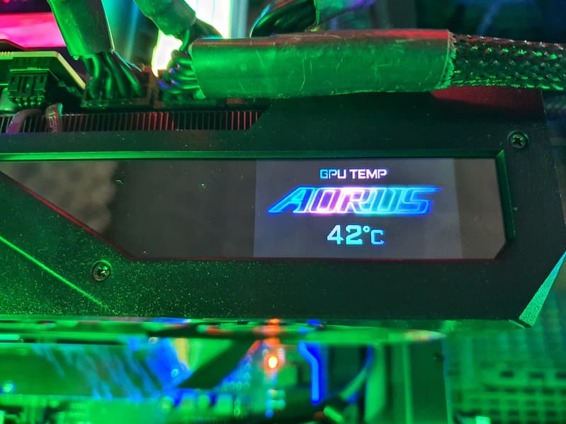 Gigabyte Aorus GeForce RTX 3080 Xtreme 10G (10 ГБ) — один из лучших представителей флагманского ускорителя GeForce RTX 3080, практически самого мощного на сегодня в игровом сегменте. Карта имеет вычурный дизайн не только с красивой подсветкой, но и с экраном на торце, на который можно вывести любые картинки или данные мониторинга карты, что очень полезно, учитывая крупные цифры информационного табло. Плата имеет прекрасный потенциал в плане разгона, но драйверы Nvidia не дают ему раскрыться.