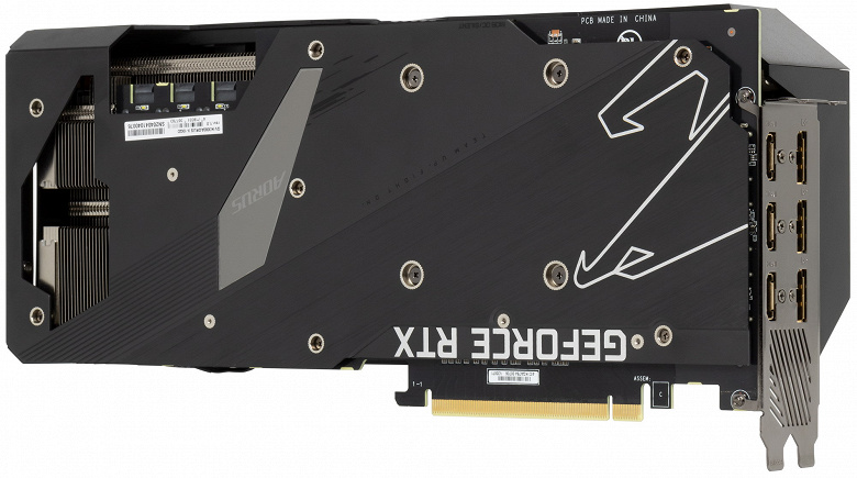 При этом инженеры Gigabyte воспользовались идеей Nvidia о сквозном продуве радиатора справа, потому СО гораздо длиннее печатной платы, что дает возможность предусмотреть окно в задней пластине для такого продува.