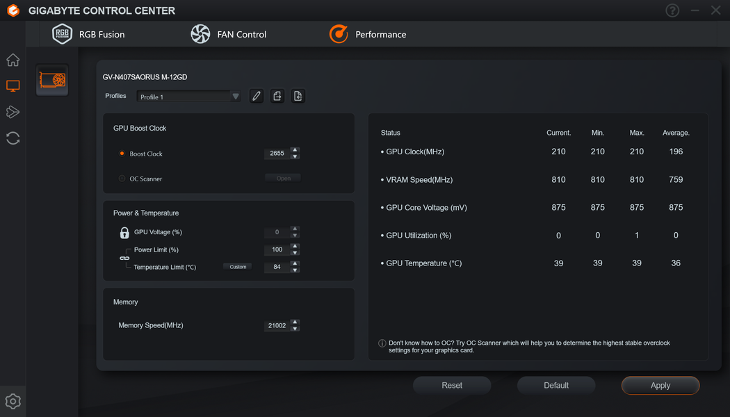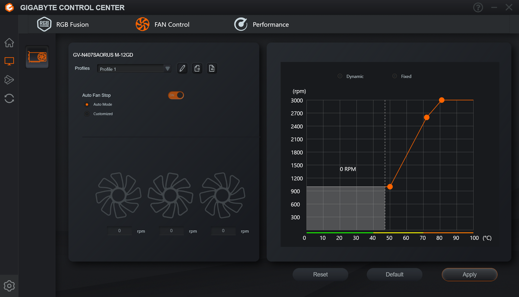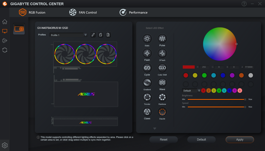 Управление традиционно осуществляется через утилиту Gigabyte Control Center. Стоит отметить интересный режим свечения на краях лопастей, когда скорость смены цветов соответствует частоте вращения вентиляторов.