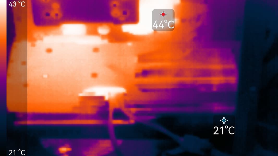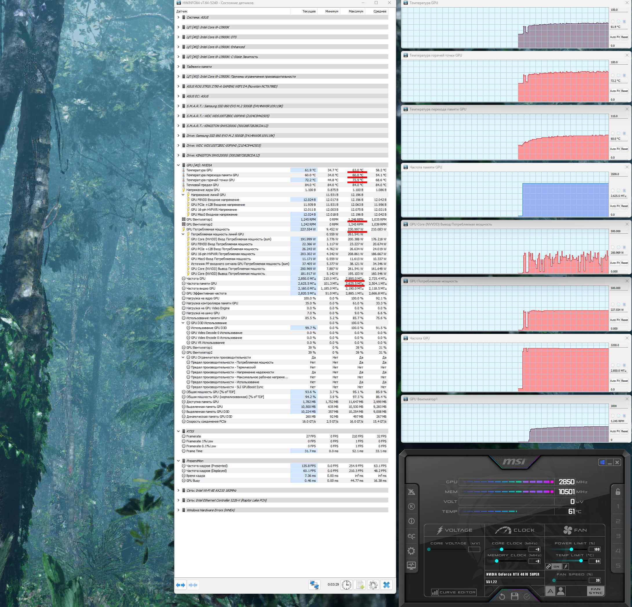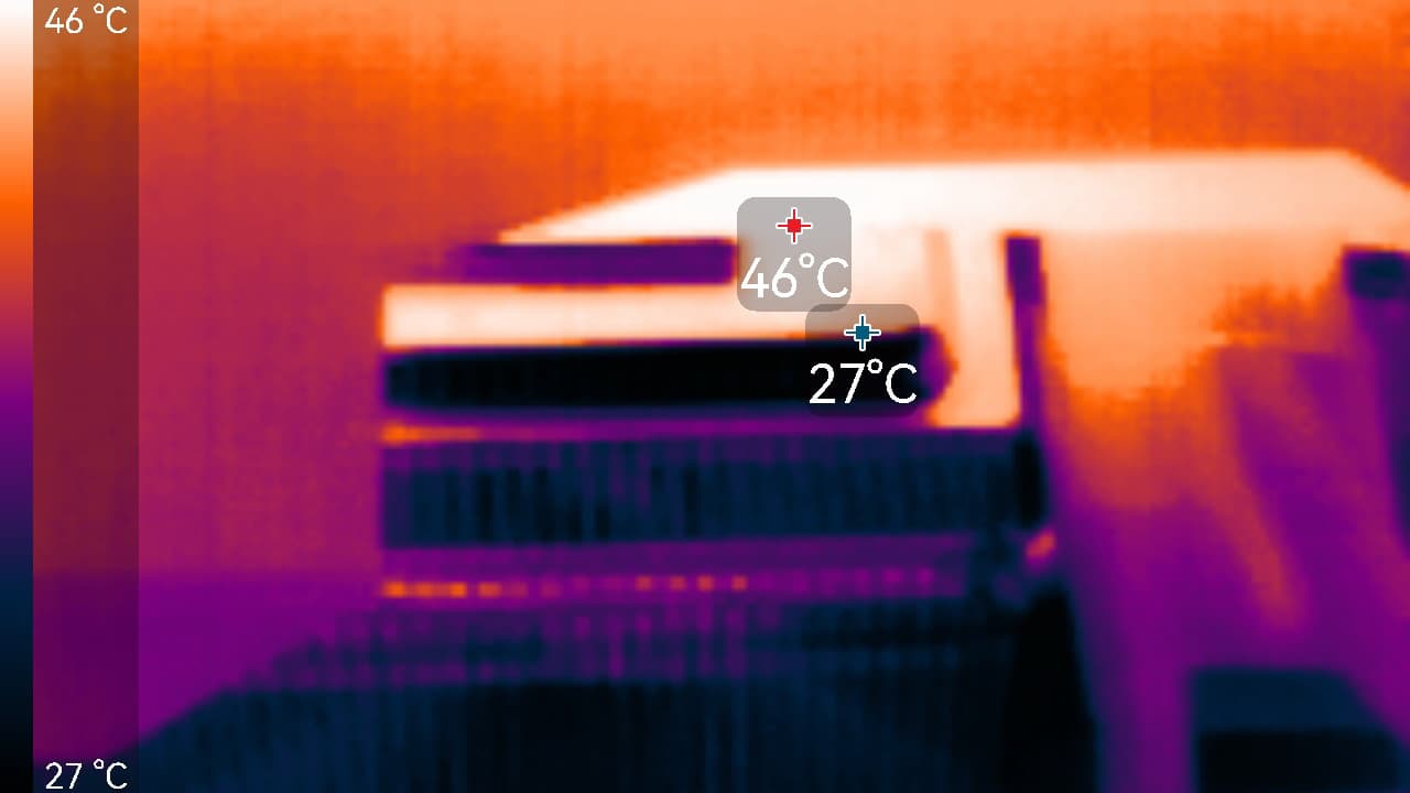 После 2-часового прогона под нагрузкой максимальная температура ядра не превысила 61 градус (hot spot — 72 °C), а температура микросхем памяти — 56 градусов, что является великолепным результатом для видеокарт такого уровня. Энергопотребление карты доходило до 233 Вт (пиковые всплески до 265 Вт). Напомним, что безопасный предел нагрева памяти GDDR6X — 105 °C.