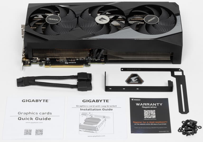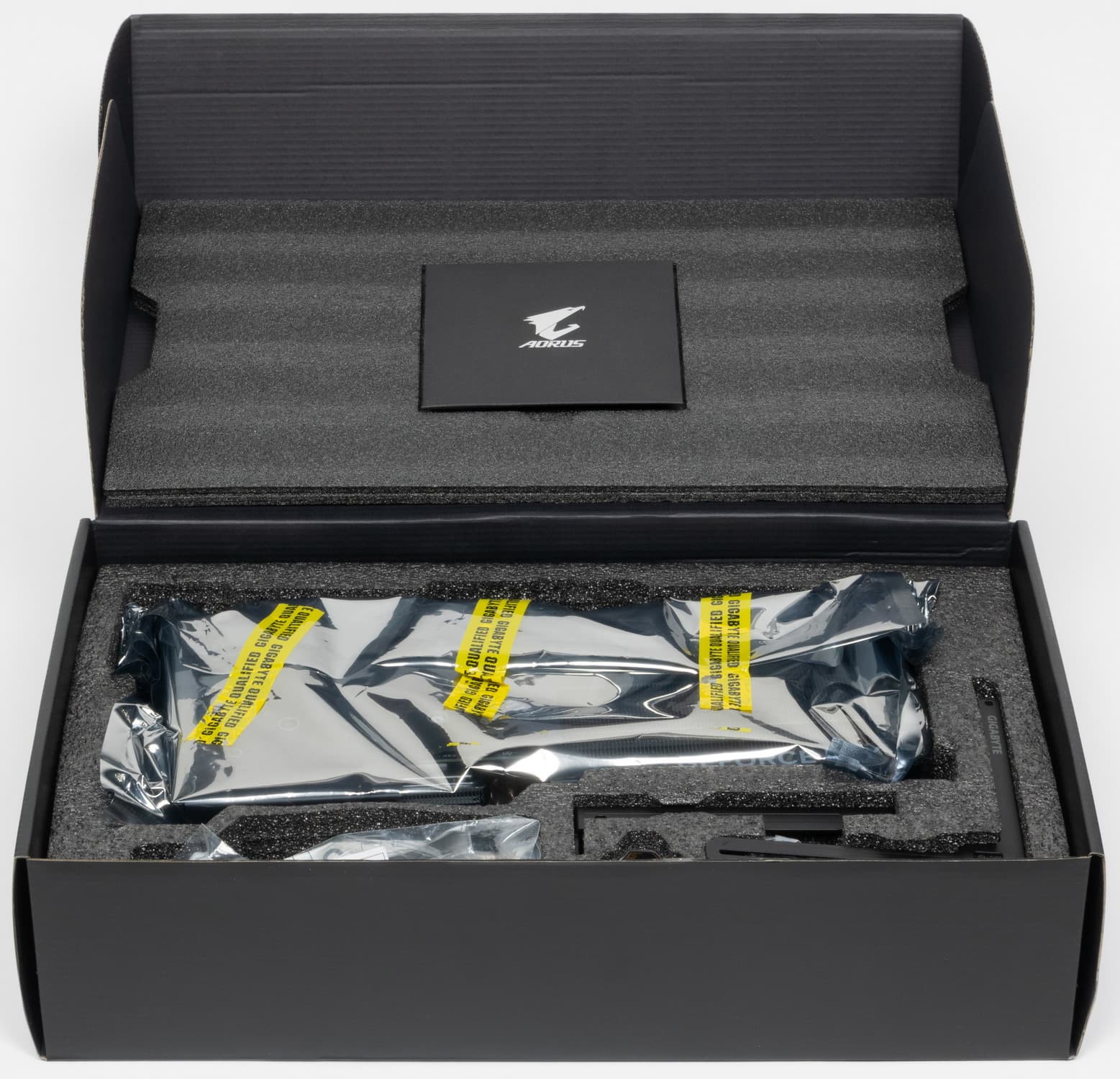 В комплекте поставки кроме традиционного краткого руководства пользователя имеются фирменный стикер Aorus, разборная металлическая подставка-кронштейн под карту с набором крепежа и переходник питания.