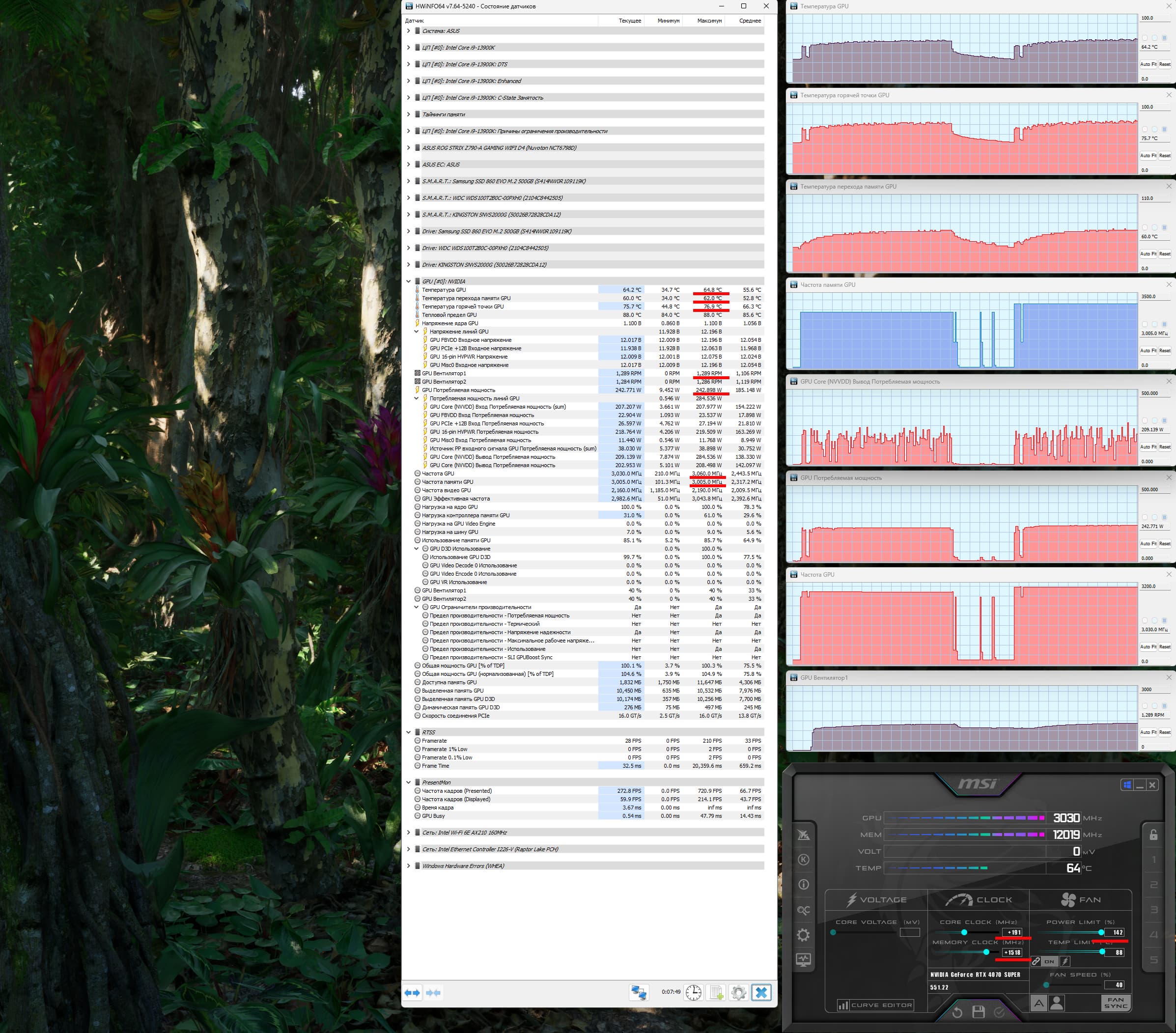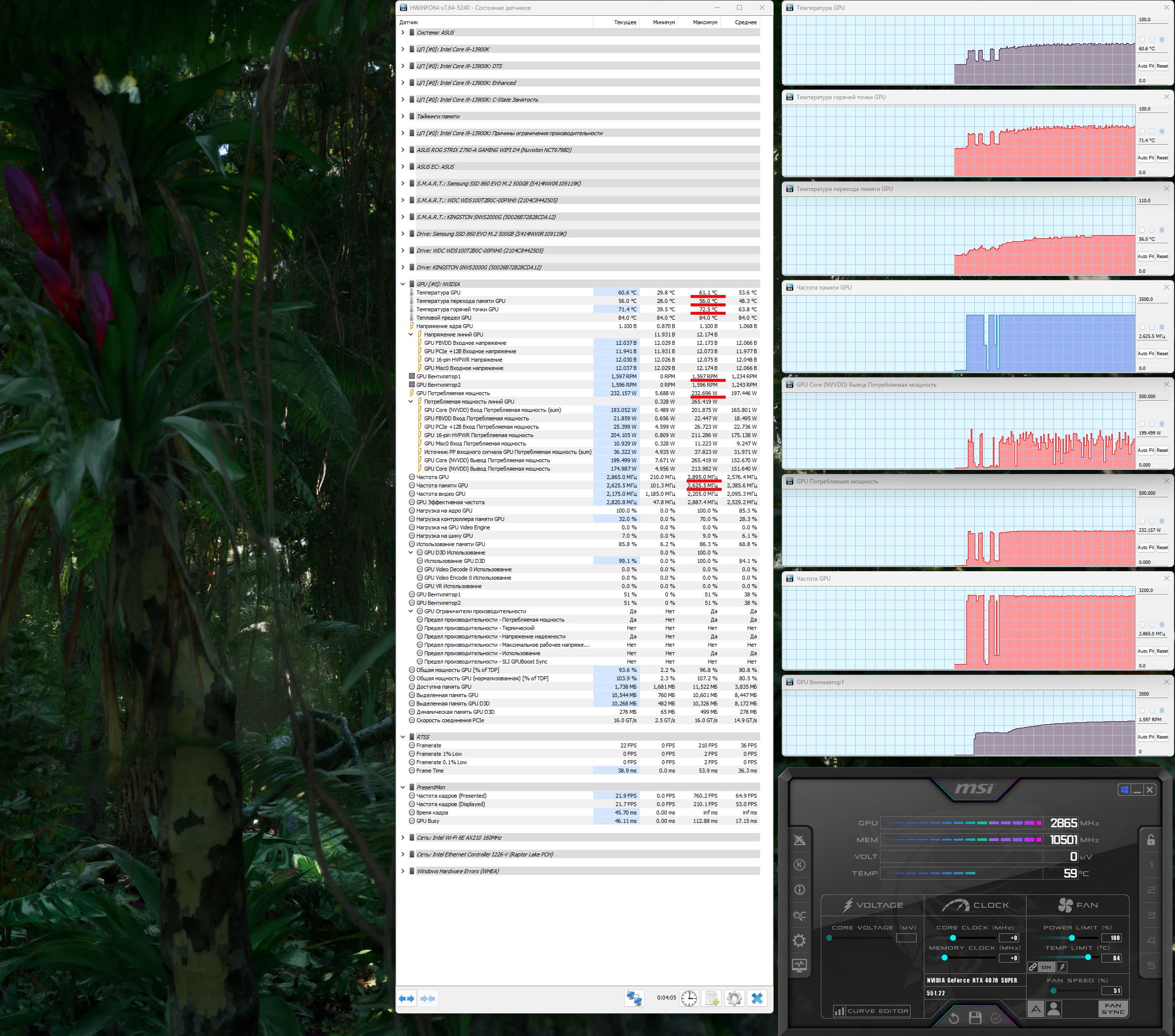 При ручном разгоне (режим BIOS Silent) при выставлении лимита потребления в 142% параметры нагрева и шума менялись мало (максимальная температура ядра достигла 65 градусов, Hot spot — 77 °C, памяти — 62 градусов), потребление вырастало до 243 Вт (пиковые всплески до 284 Вт).