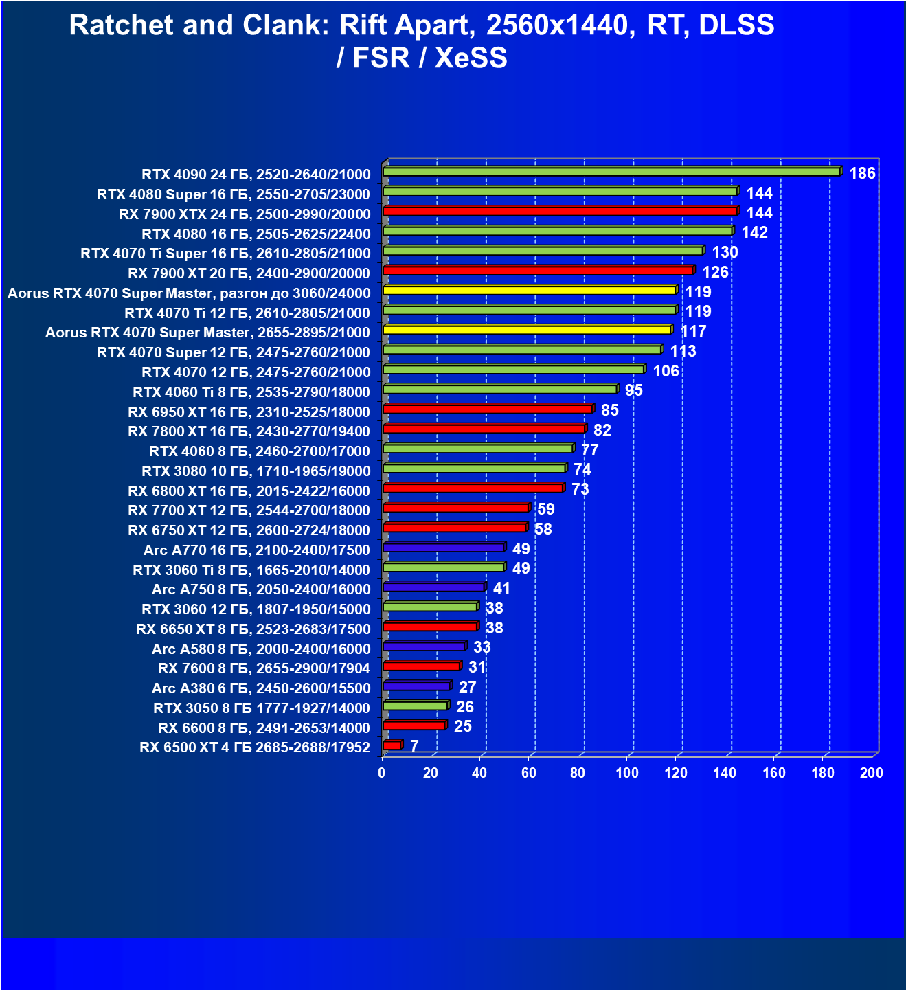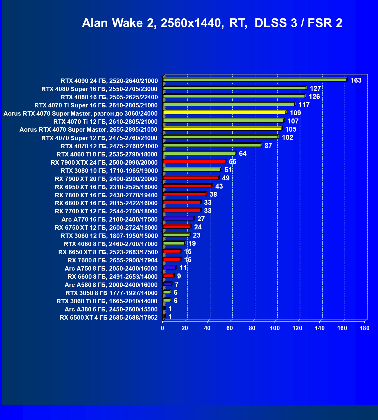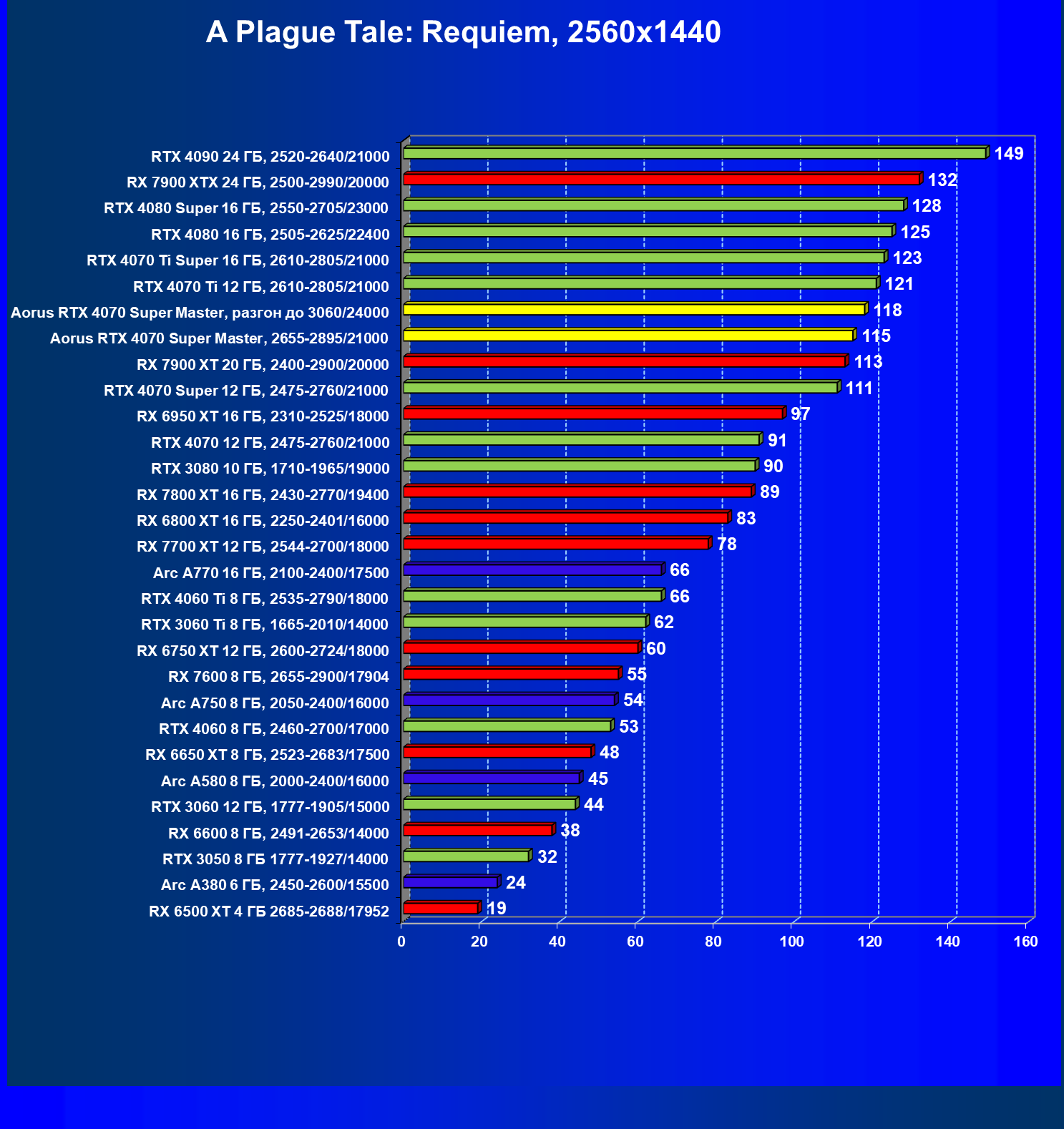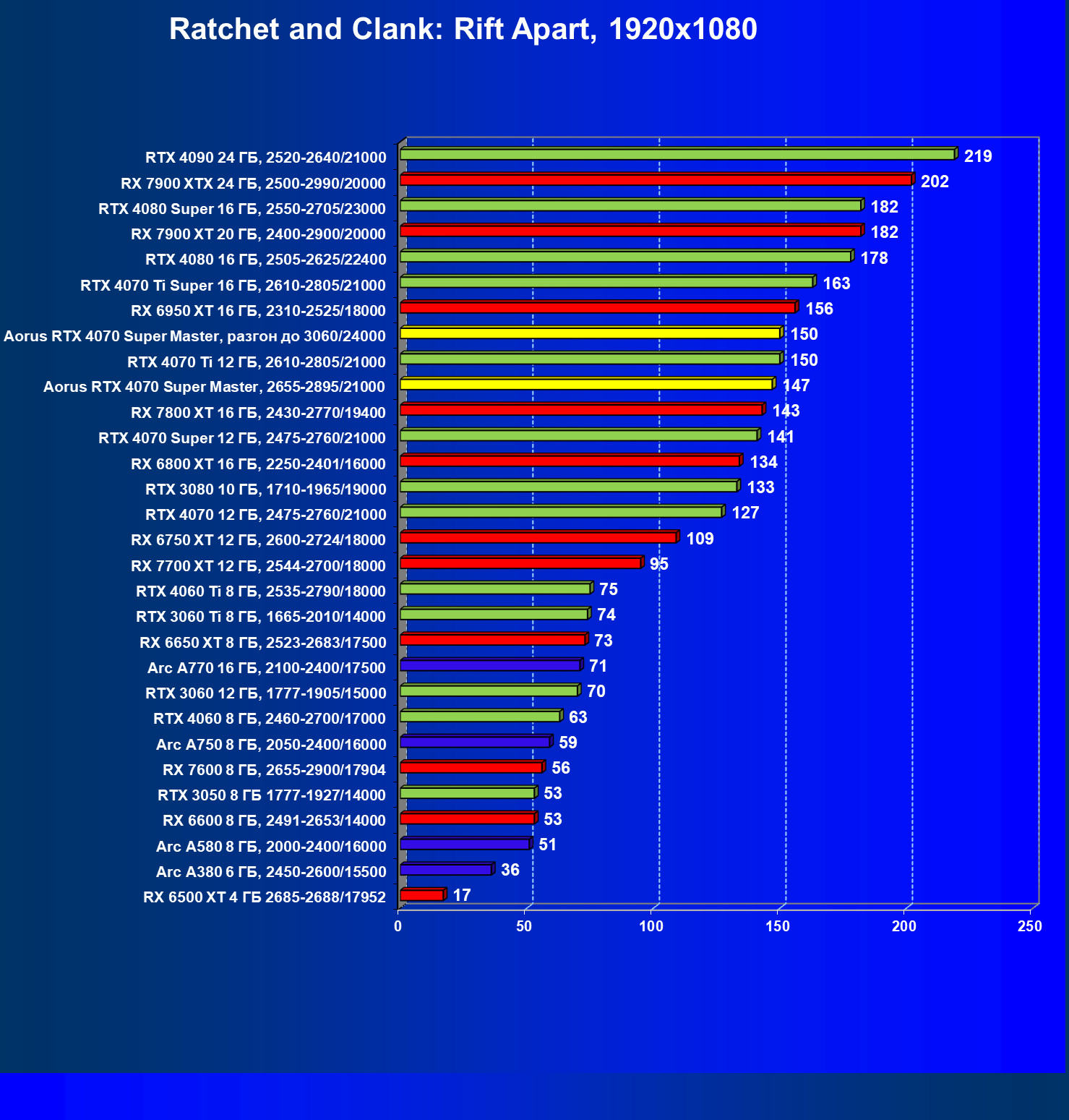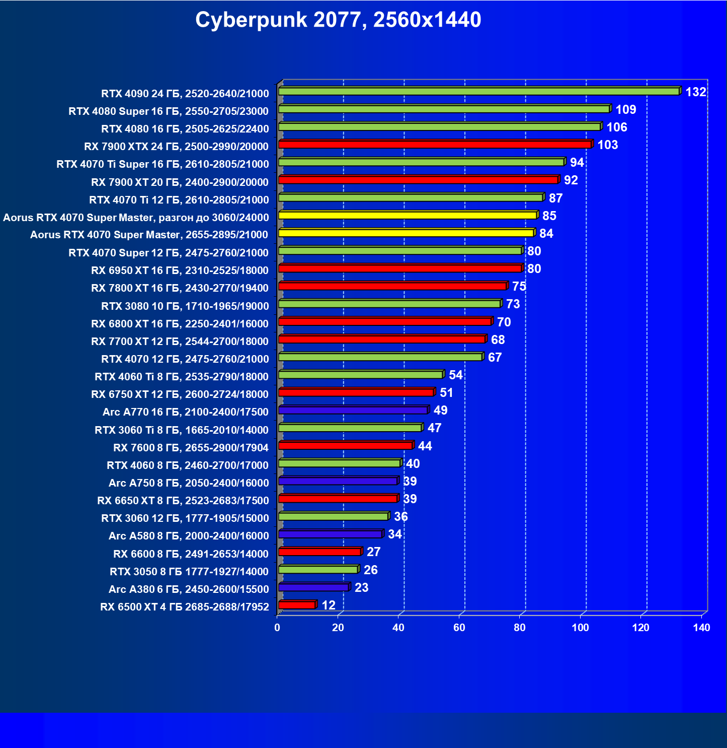 | 06 | Aorus RTX 4070 Super Master, разгон до 3060/24000 | 1792 | 219 | 82 000 |