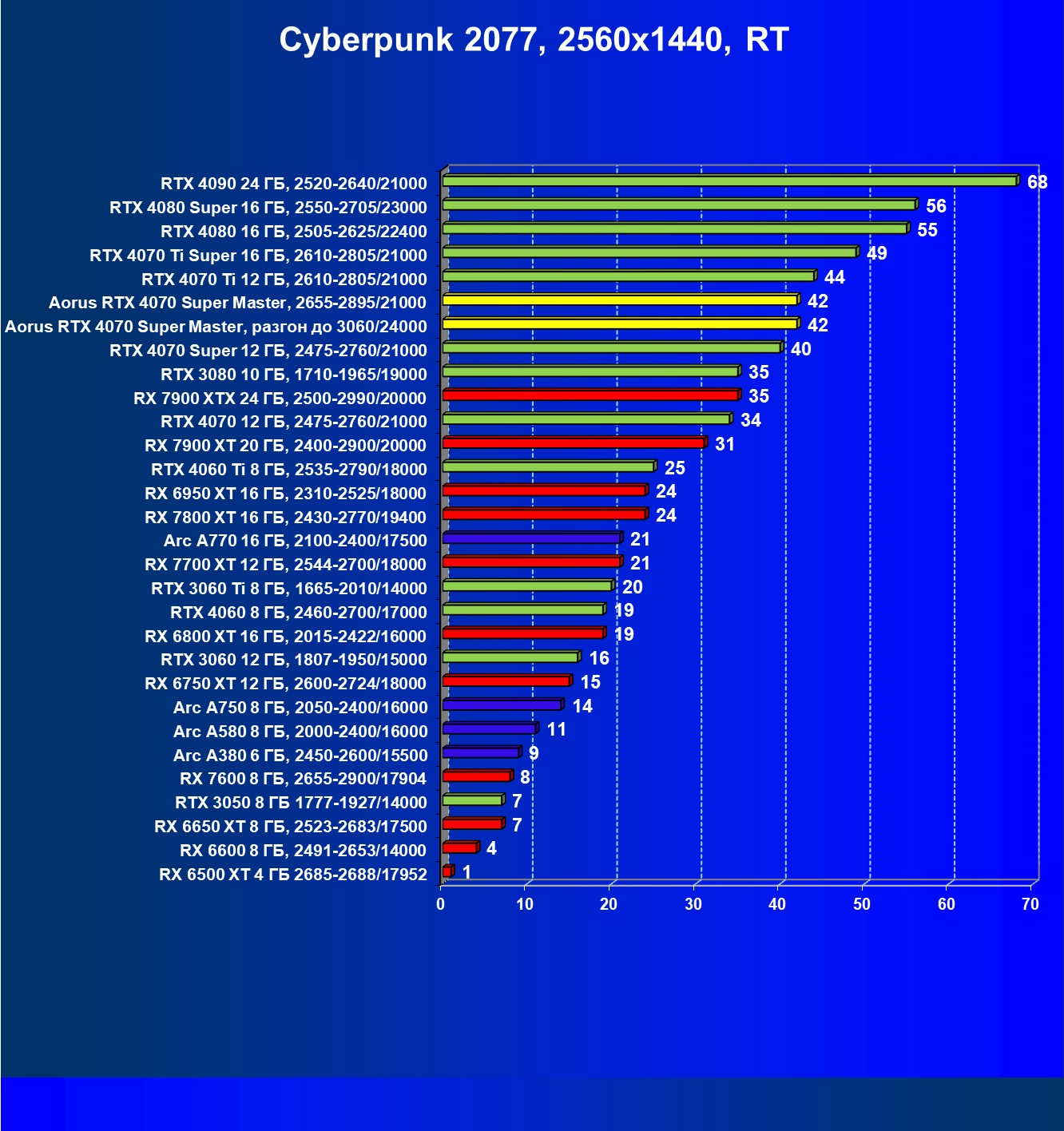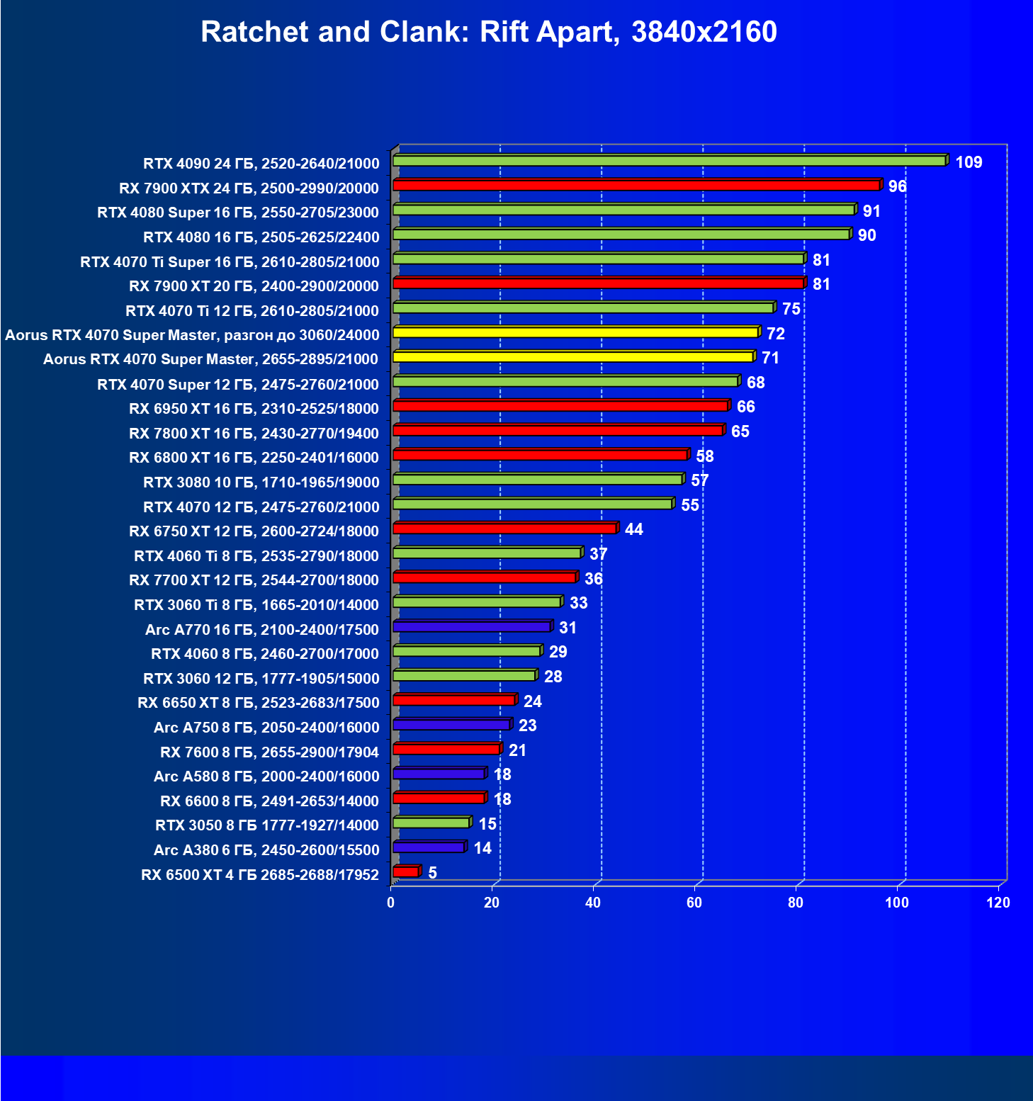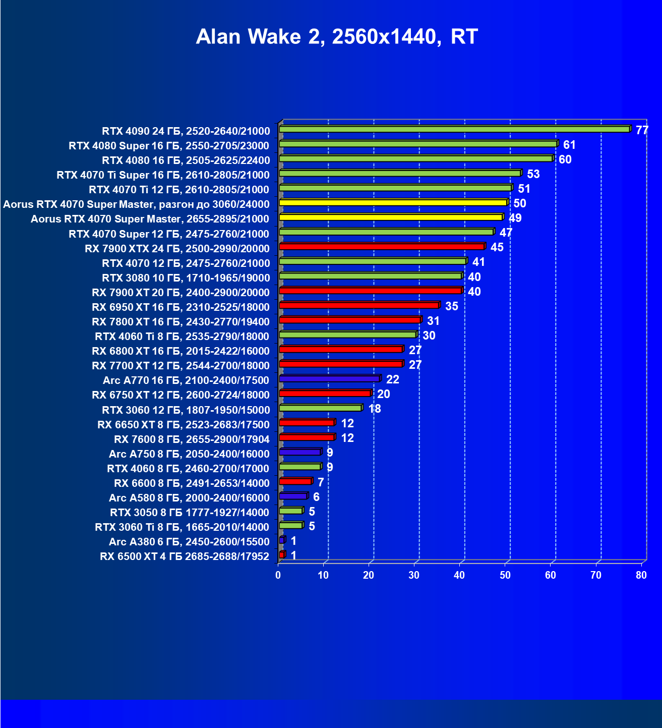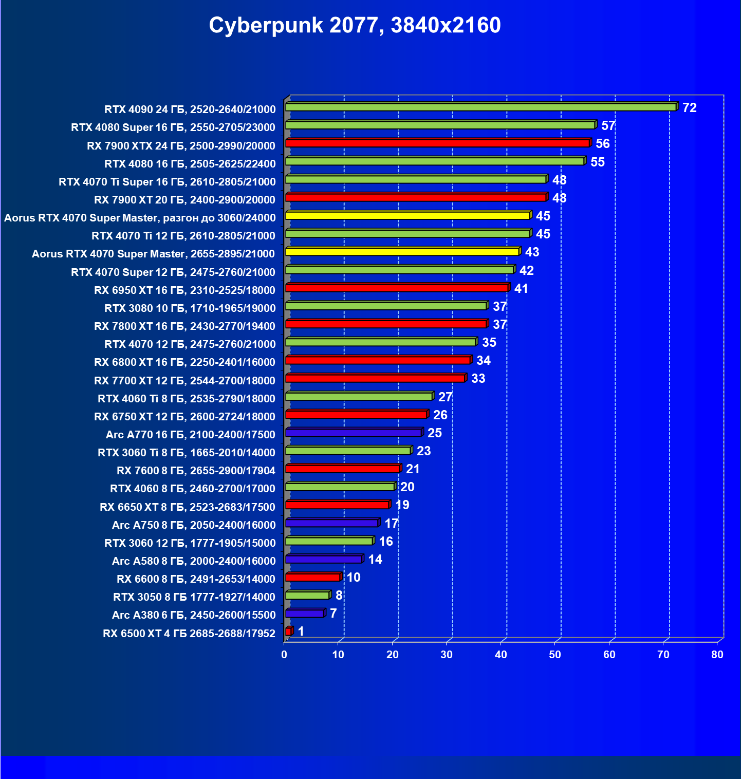 | 24 | Aorus RTX 4070 Super Master, 2655—2895/21000 | 72 | 589 | 82 000 |