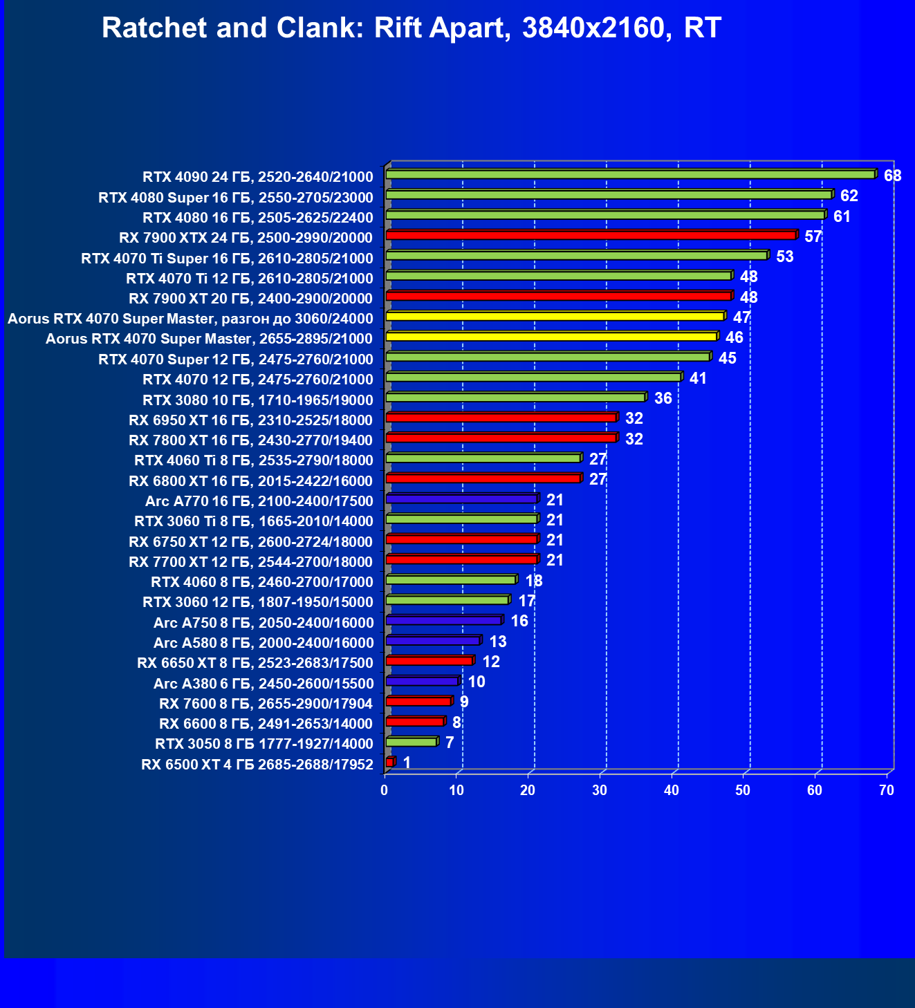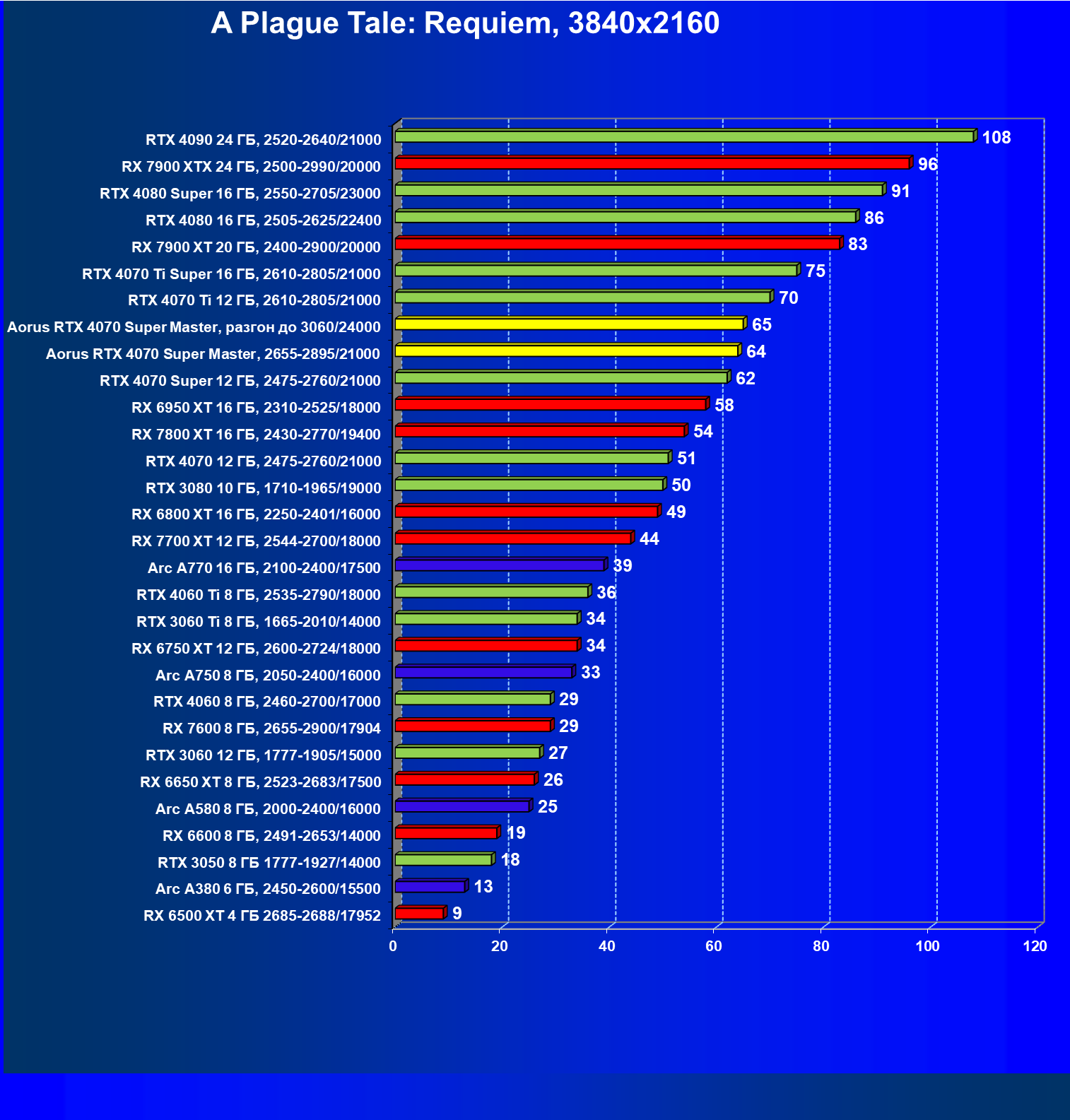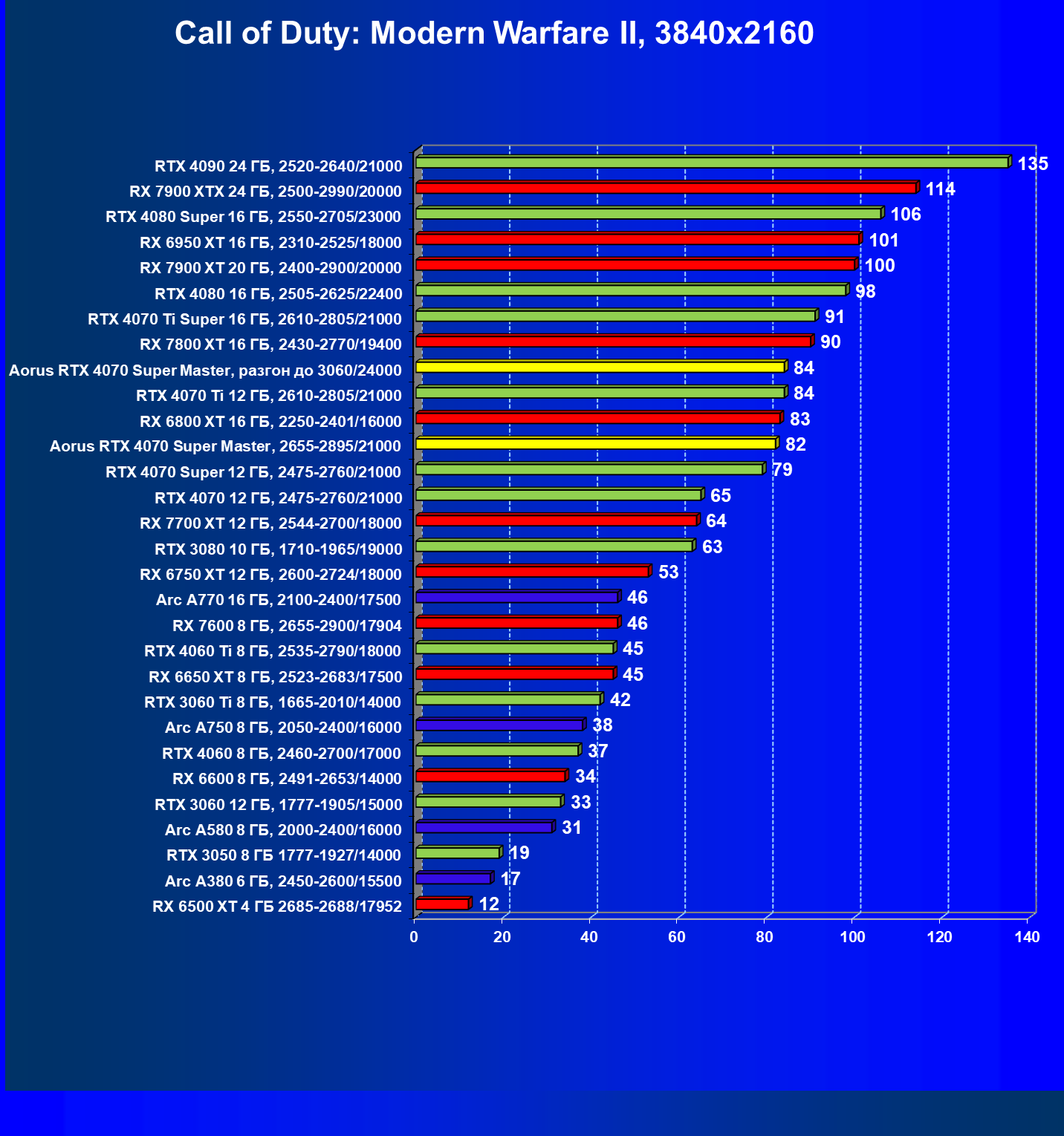 | 24 | Aorus RTX 4070 Super Master, 2655—2895/21000 | 72 | 589 | 82 000 |