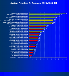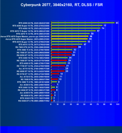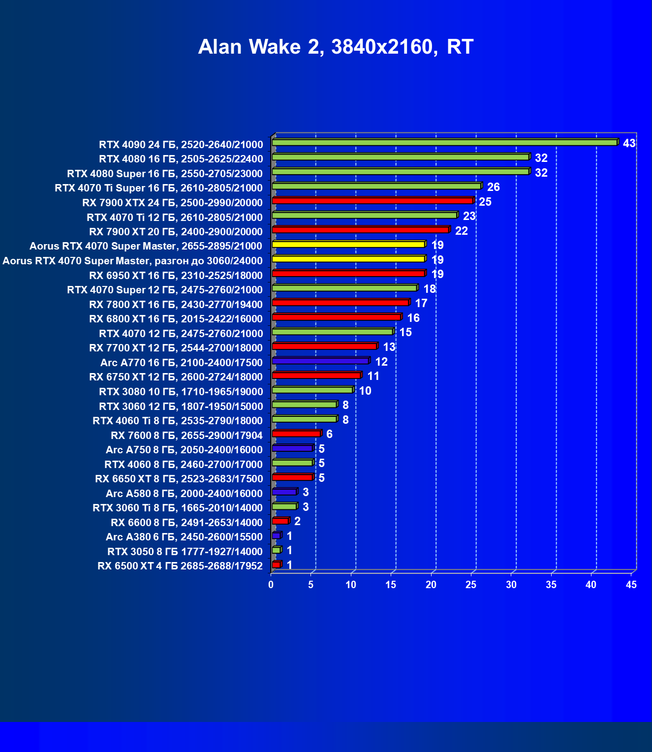 Включение RT снижает производительность, однако реализованные уже практически во всех играх с трассировкой лучей технологии Nvidia DLSS и AMD FSR (а то и Intel XeSS) сильно помогают компенсировать падение скорости от использования RT. Так что в итоге для мощных карт уровня GeForce RTX 4070 Super/Ti предыдущие выводы по разрешениям остаются в силе. При этом они обходят даже флагмана последнего поколения AMD — Radeon RX 7900 XTX.