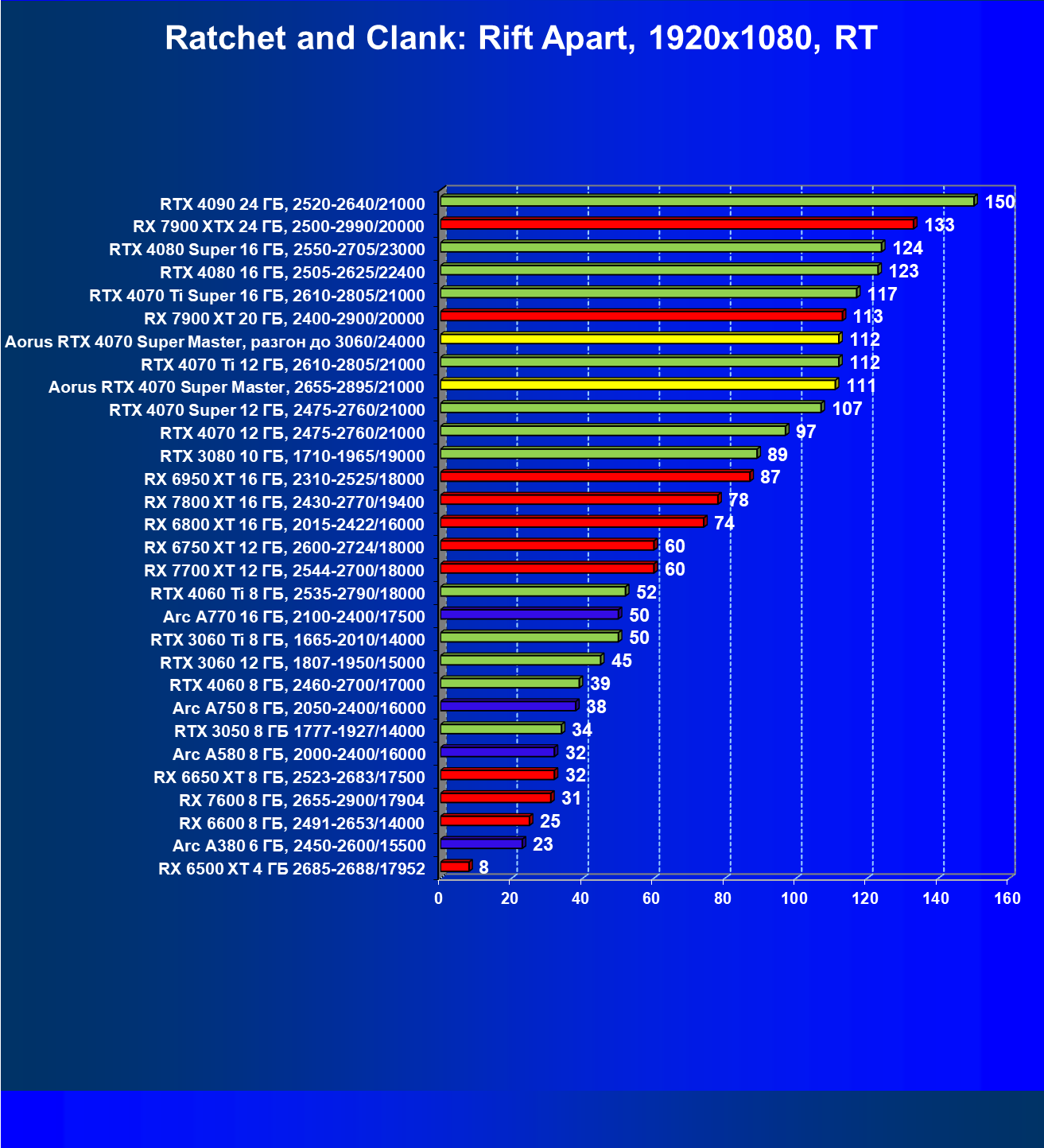 В классических играх GeForce RTX 4070 Super отстает от GeForce RTX 4070 Ti на 9%, но карта Gigabyte за счет фабричного разгона в значительной мере «съедает» эту разницу. Radeon RX 7800 XT и Radeon RX 6950 XT оказываются чуть ниже по производительности (и дешевле).
