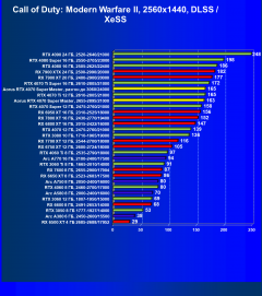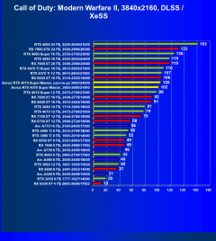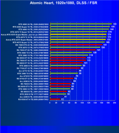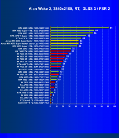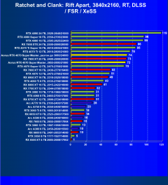 Рейтинг составлен по 9 тестам, в которых используется технология трассировки лучей и одновременно технология Nvidia DLSS, AMD FSR или Intel XeSS. Этот рейтинг нормирован по самому слабому ускорителю в данной группе — Radeon RX 6500 XT (то есть сочетание скорости и функций Radeon RX 6500 XT приняты за 100%).