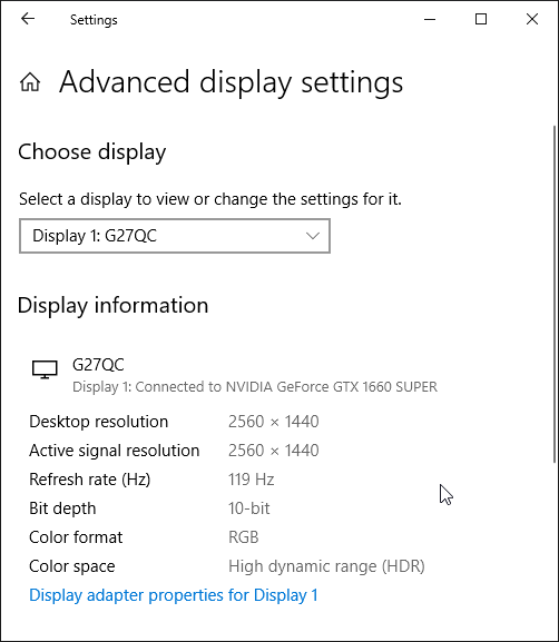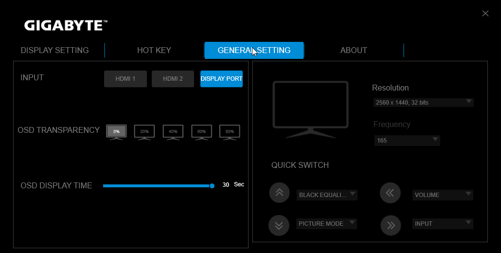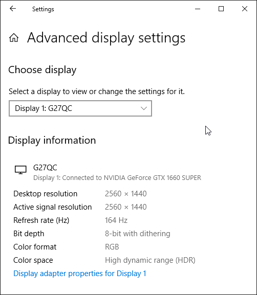 При подключении к компьютеру по DisplayPort поддерживалось разрешение до 2560×1440 при 165 Гц кадровой частоты на вход, и вывод изображения на экран также осуществлялся с этой частотой, в случае HDMI — только до 2560×1440 при 144 Гц. При таком разрешении и частоте обновления поддерживаются HDR. По DisplayPort при 165 Гц только 8 бит на цвет, дополненных динамическим смешением цветов, видимо, с помощью видеокарты на аппаратном уровне, а при снижении частоты обновления до 120 Гц — уже 10 бит на цвет.