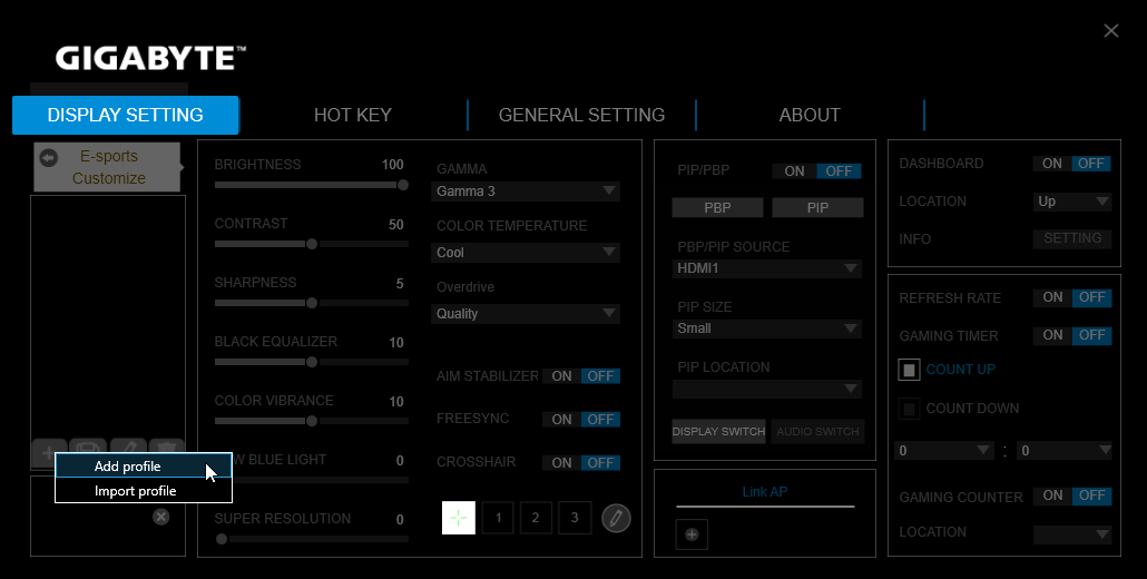 Монитором можно управлять с ПК с помощью фирменного ПО OSD Sidekick. Кроме настроек, доступных из меню монитора, в OSD Sidekick можно сохранять/загружать профили, редактировать форму прицела, задавать клавиатурные сокращения и обновлять микропрограмму монитора. Только при запущенной OSD Sidekick на монитор выводятся (должны выводиться) данные на панель Dashboard. И именно в OSD Sidekick задаются клавиатурные сокращения, которым пользователь может увеличивать и уменьшать значение пользовательского счетчика. Что им полезно будет считать — зависит от игры.