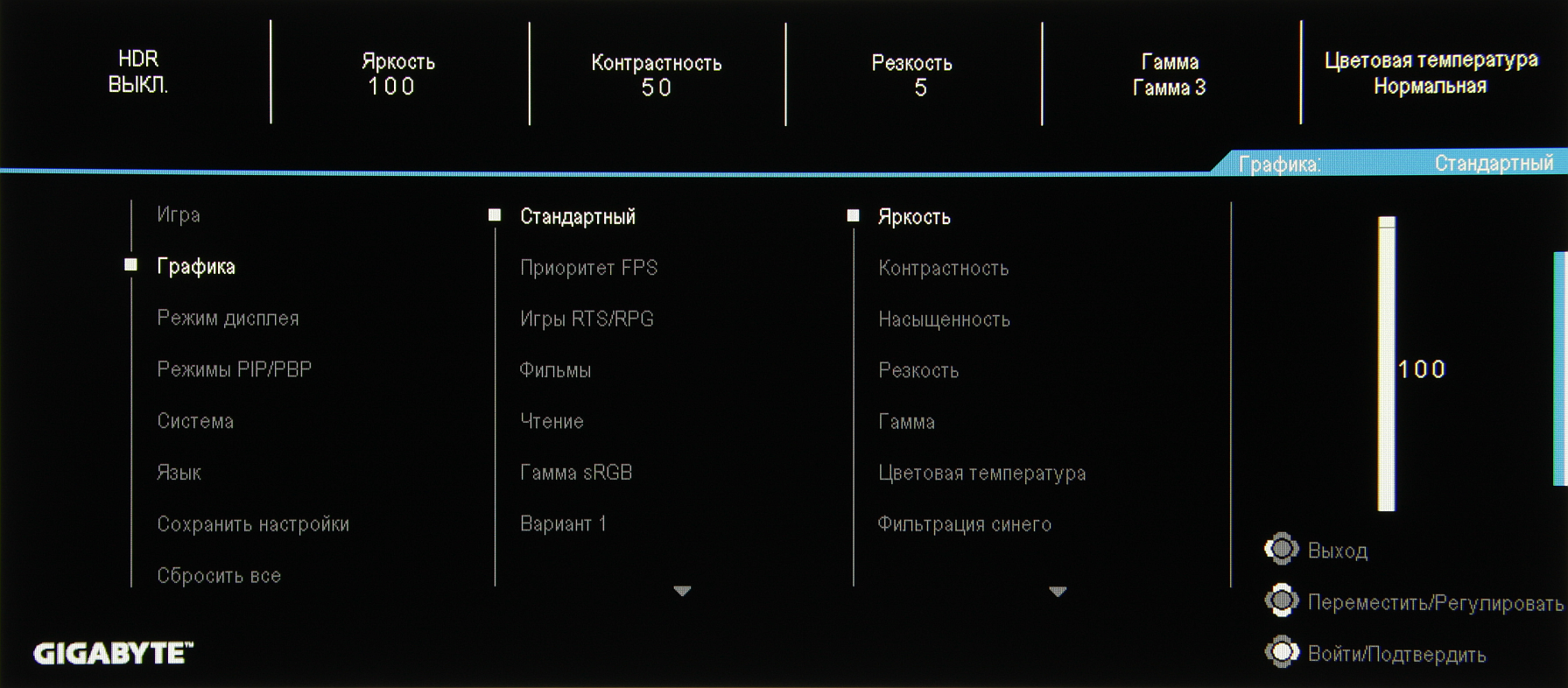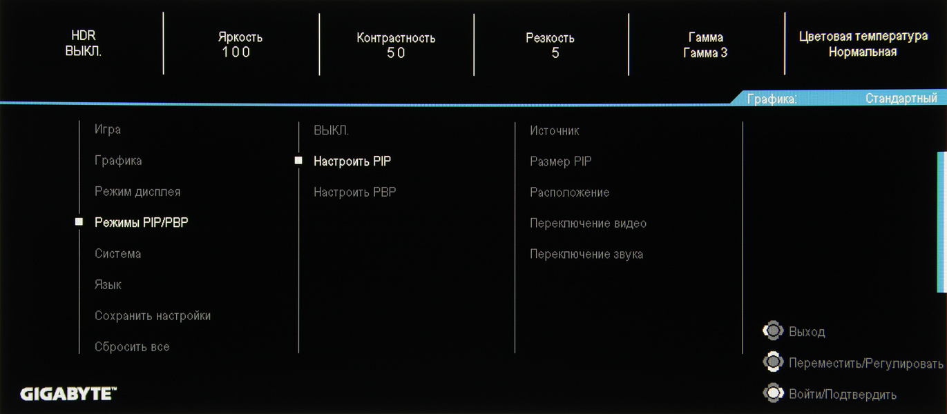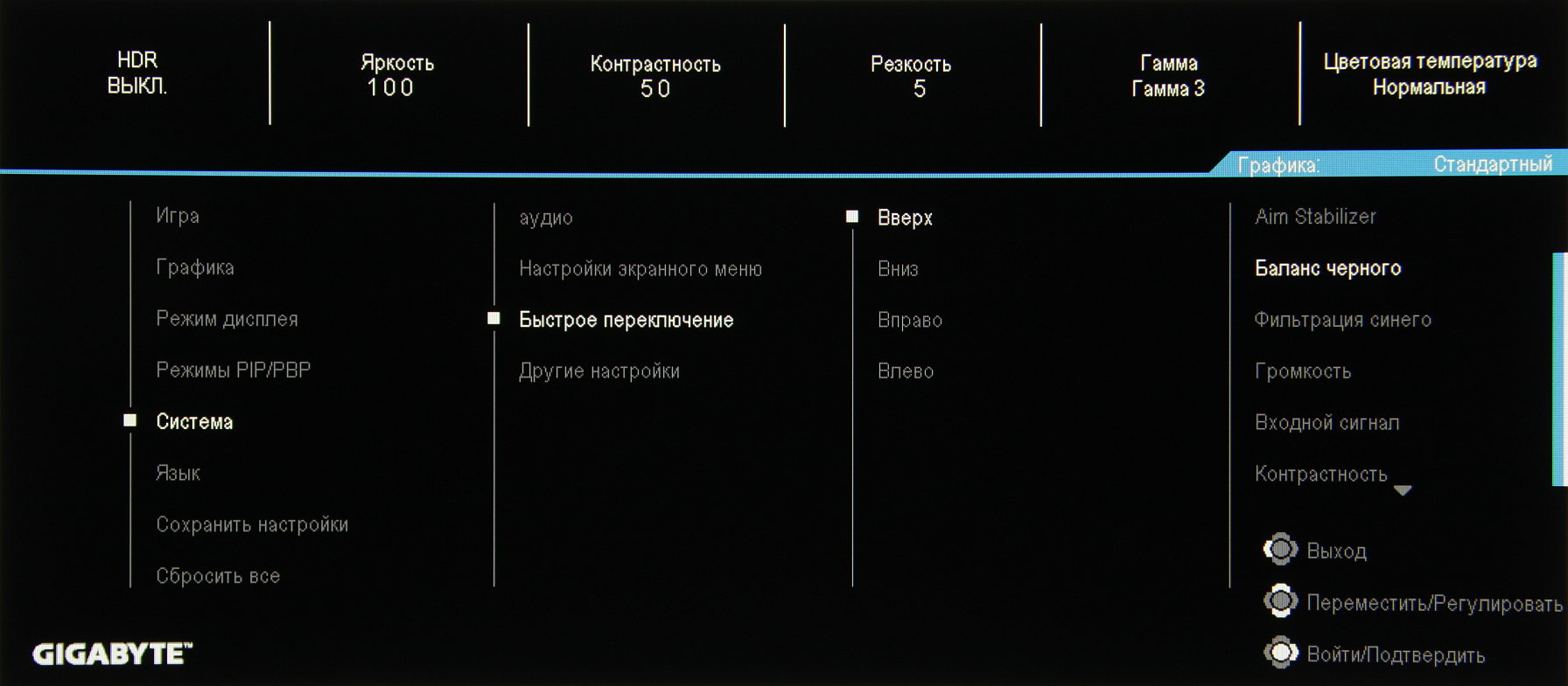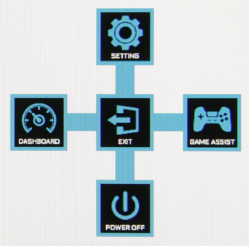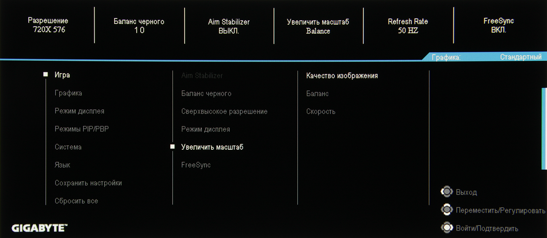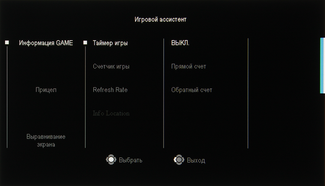 Если на экране оно, то нажатие на джойстик — выход из меню, отклонение вниз — выключение монитора (его можно выключить и без меню длительным нажатием на джойстик), вверх — вход в основное меню установок, вправо — меню с настройками игровых функций, влево — настройка информационной панели.