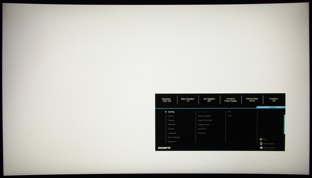 Есть режим со вставкой темного кадра (черным он в данном случае не является) с названием Aim Stabilizer (зависимости яркости от времени — в правой части рисунка выше). Четкость в движении действительно повышается (и производитель может указывать невероятные 1 мс с оговоркой, что это характеристика четкости в движении — MPRT), но из-за обнаруживаемого в некоторых случаях мерцания с частотой максимум в 165 Гц данный режим рекомендуется использовать с осторожностью, так как мерцание может приводить к повышенной утомляемости глаз.