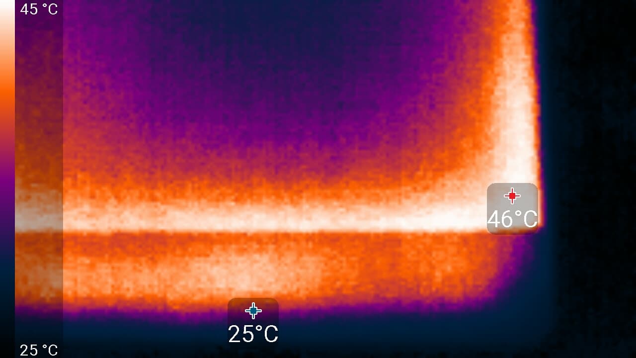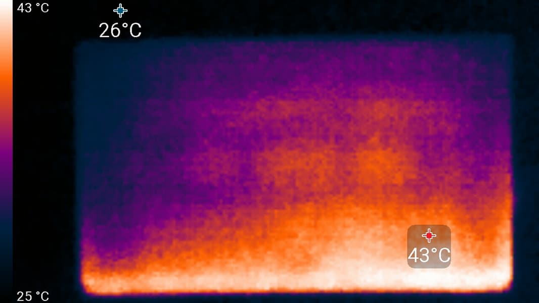 Видимо, внизу находится светодиодная линейка подсветки экрана. Нагрев сзади умеренный.