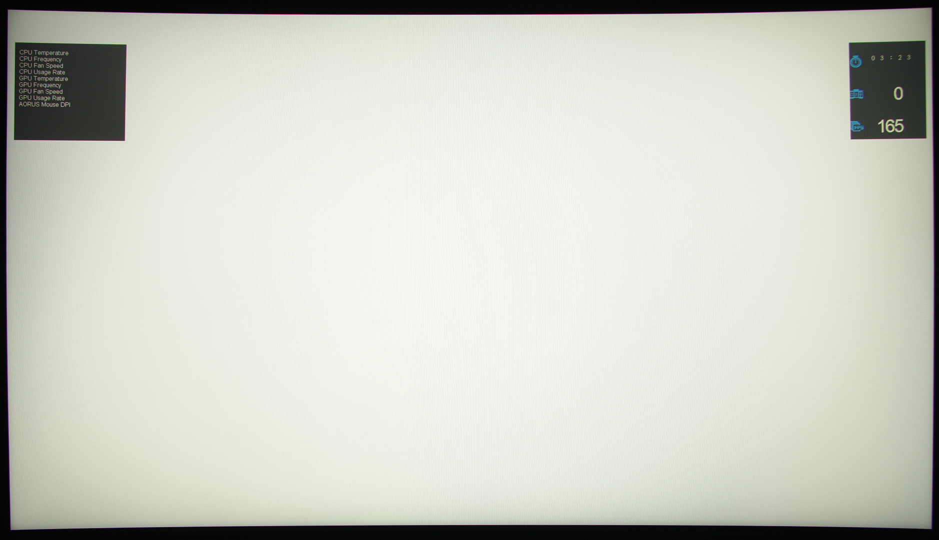 Видно, что даже без разгона при 165 Гц чередования максимальная яркость белого кадра лишь немного ниже уровня 90% белого, а минимальная яркость черного кадра практически равна черному в статике. То есть скорости матрицы даже без разгона достаточно для полноценного вывода изображения с кадровой частотой 165 Гц. После разгона яркость белого кадра существенно выше уровня 90% белого.
