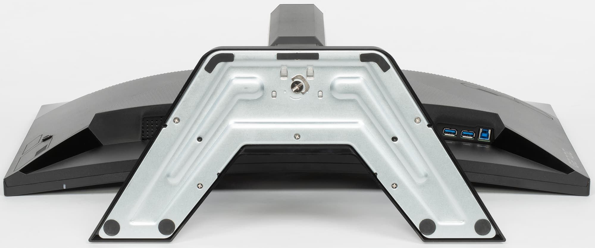 Несущие элементы подставки изготовлены из штампованной стали и алюминиевого сплава. Лапы основания подставки расходятся широко в стороны, что обеспечивает монитору хорошую устойчивость, при этом сверху на горизонтальную поверхность основания можно положить край клавиатуры. Резиновые накладки снизу на опорных плоскостях основания подставки защищают поверхность стола от царапин и предотвращают скольжение монитора на гладких поверхностях.