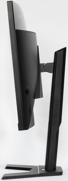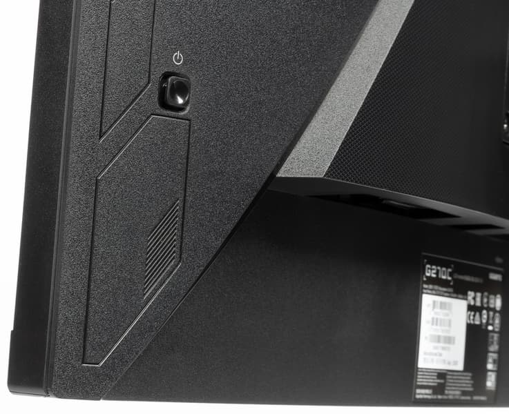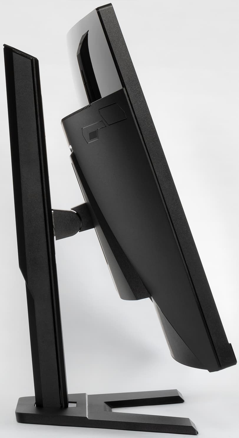 Дизайн задней панели и подставки умеренно игровой, поэтому с точки зрения внешнего вида монитор можно считать универсальным. Панели монитора и кожухи стойки подставки изготовлены из черного пластика в основном с просто матовой поверхностью, но местами есть мелкий рельефный узор и глянцевые участки.