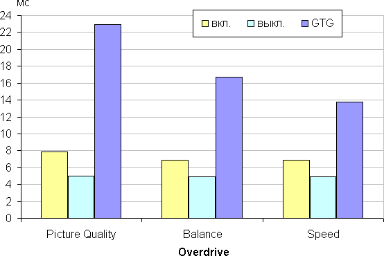Время отклика зависит от значения настройки Overdrive (переведенной как Увеличить масштаб), которая управляет разгоном матрицы. Ступени регулировки три. График ниже показывает, как меняется время включения и выключения при переходе черный-белый-черный (столбики «вкл.» и «выкл.»), а также среднее суммарное время для переходов между полутонами (столбики GTG) в случае режима с частотой обновления 165 Гц: