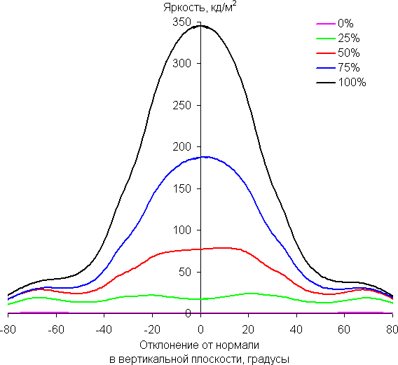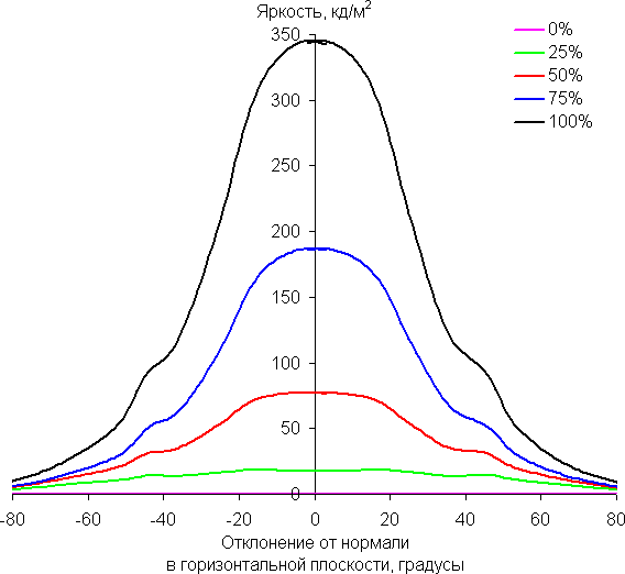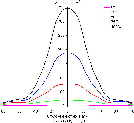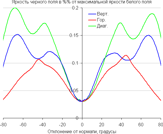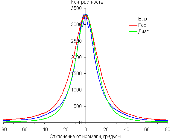 Отметим примерно одинаковый характер уменьшения яркости при отклонении от перпендикуляра к экрану во всех трех направлениях, при этом графики не пересекаются в имеющим значение диапазоне измеряемых углов. Яркость снижается сильно уже при небольшом отклонении от перпендикуляра к экрану, поэтому по скорости снижения яркости углы обзора узкие. При отклонении в диагональном направлении яркость черного поля достигает большего значения, чем в двух других случаях. Однако максимум яркости черного поля все равно меньше, чем в случае типичного монитора на матрице IPS. Контрастность в диапазоне углов ±82° приближается к отметке 10:1 только при отклонении по диагонали, но все равно остается существенно выше этого значения.