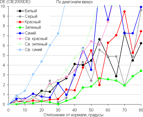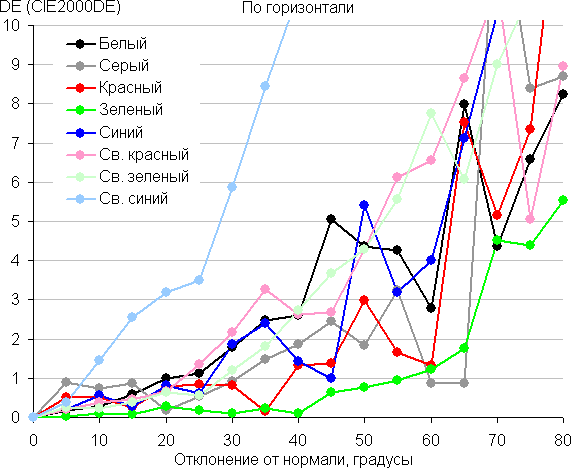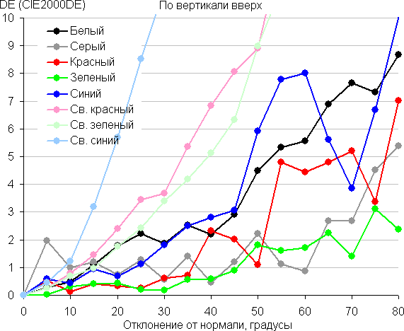 Для количественной характеристики изменения цветопередачи мы провели колориметрические измерения для белого, серого (127, 127, 127), красного, зеленого и синего, а также светло-красного, светло-зеленого и светло-синего полей во весь экран с использованием установки, подобной той, что применялась в предыдущем тесте. Измерения проводились в диапазоне углов от 0° (датчик направлен перпендикулярно к экрану) до 80° с шагом в 5°. Полученные значения интенсивностей были пересчитаны в ΔE относительно замера каждого поля при перпендикулярном положении датчика относительно экрана. Результаты представлены ниже: