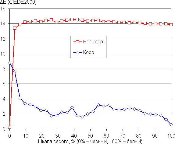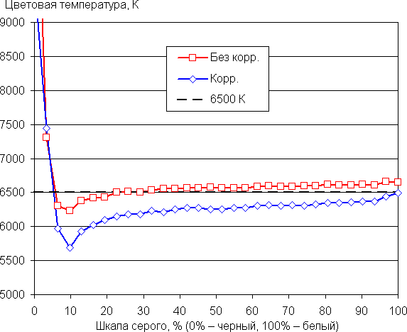 Самый близкий к черному диапазон можно не учитывать, так как в нем цветопередача не так важна, а погрешность измерения цветовых характеристик высокая. Ручная коррекция приблизила цветовую температуру к стандартным 6500 К на белом поле и существенно уменьшила значение ΔE. Однако с практической точки зрения и с учетом игрового предназначения монитора особой необходимости в такой коррекции нет. Также не будет критичным некоторое завышение насыщенности цветов.