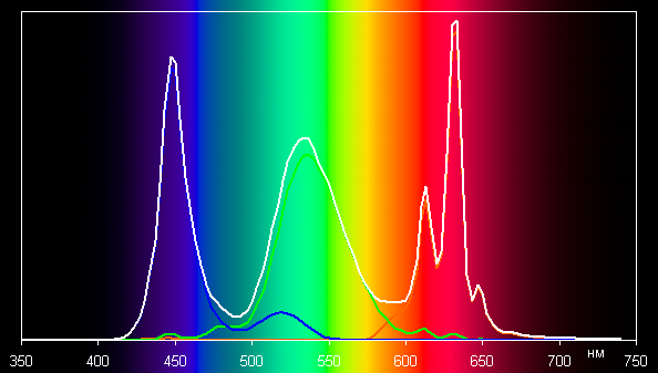 Ниже приведен спектр для белого поля (белая линия), наложенный на спектры красного, зеленого и синего полей (линии соответствующих цветов), когда нет корректировки цветового охвата (или она минимальная):