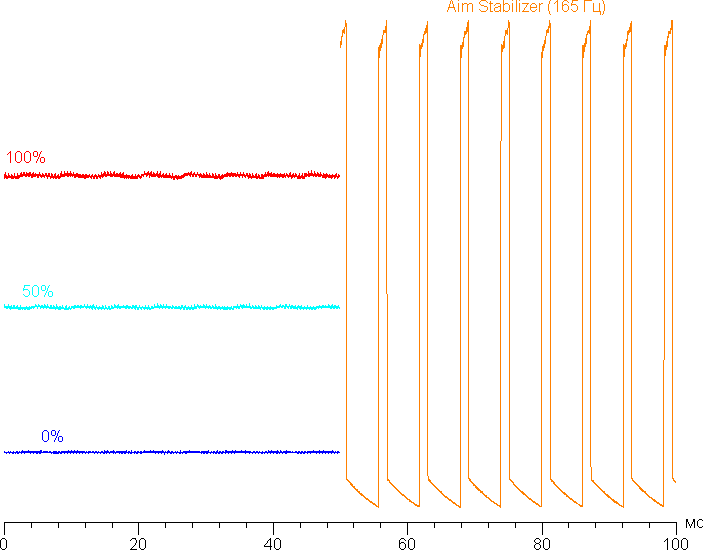 Яркость монитора меняется именно яркостью подсветки, то есть без ущерба для качества изображения (сохраняется контрастность и количество различимых градаций) яркость монитора можно менять в довольно широких пределах, что позволяет с комфортом играть, работать и смотреть фильмы как в освещенном, так и в темном помещении, хотя для последнего случая минимальная яркость кому-то может показаться высоковатой. На любом уровне яркости значимая модуляция подсветки отсутствует, что исключает видимое мерцание экрана. Для тех, кто привык распознавать знакомое сокращение, уточним: ШИМ отсутствует. В доказательство приведем графики зависимости яркости (вертикальная ось) от времени (горизонтальная ось) при различных значениях настройки яркости (левая часть рисунка):