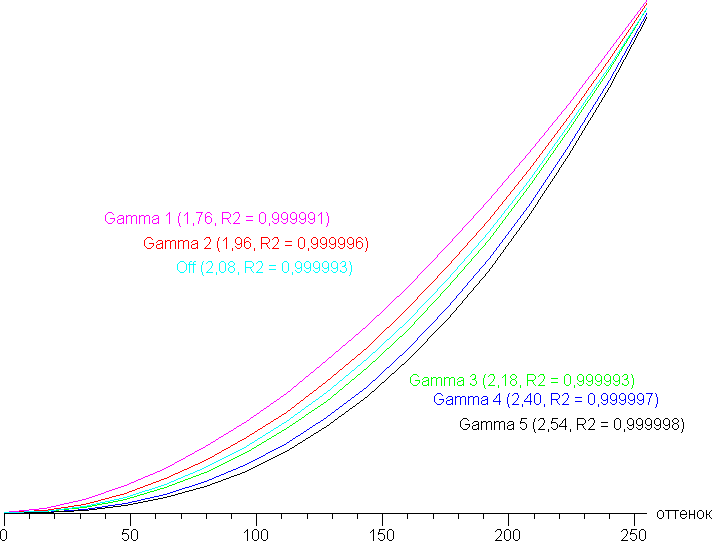 Реальная гамма-кривая зависит от выбранного значения списке Gamma (Гамма). Значения показателей аппроксимирующей функции приведены в скобках в подписях, там же — коэффициент детерминации: