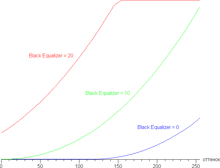 Дополнительной настройкой Black Equalizer (Баланс черного) можно скорректировать гамма-кривую, улучшая различимость деталей в тенях. Это может быть полезно в играх с темными сценами. Ниже приведена гамма-кривая при крайних значениях Black Equalizer: