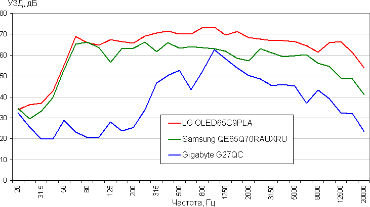 Встроенные громкоговорители звучат согласно их размерам и акустическому окружению — настолько громко, чтобы сидящий перед монитором пользователь хотя бы расслышал системные сигналы, без низких частот вообще, с выраженным «пластиковым» призвуком из-за резонансов корпуса, со слабым стереофоническим эффектом. Сравним АЧХ этого монитора с АЧХ двух телевизоров высшего класса (воспроизводился розовый шум, уровни звукового давления в 1/3 октавах записывал шумомер Октава-110А-Эко):