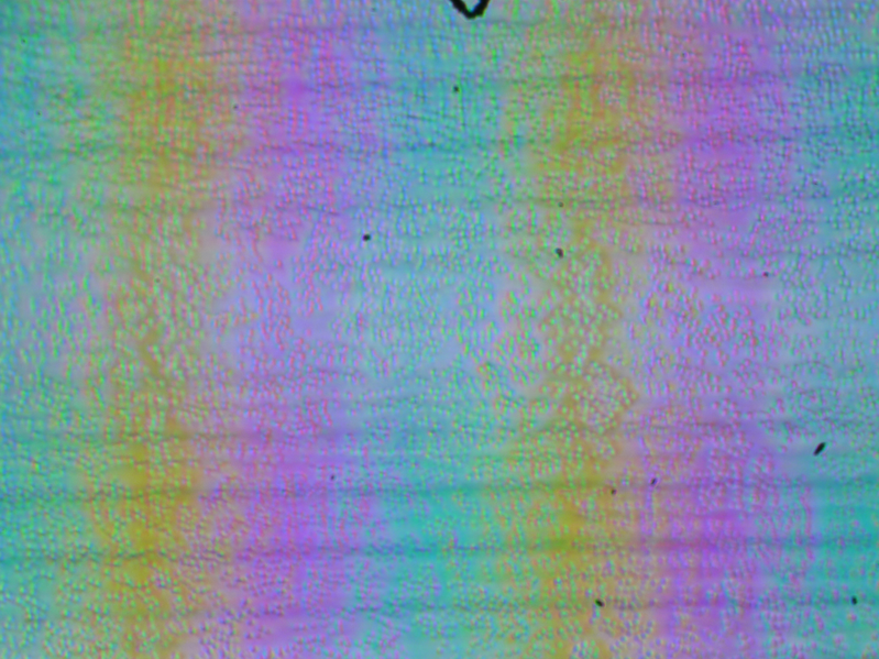 Зерно этих дефектов в несколько раз меньше размеров субпикселей (масштаб этих двух фотографий одинаковый), поэтому фокусировка на микродефектах и «перескок» фокуса по субпикселям при изменении угла зрения выражены слабо, из-за этого нет и «кристаллического» эффекта.