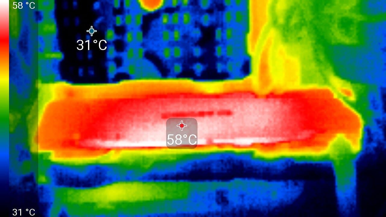 Максимальный нагрев — верхний край оборотной стороны PCB.