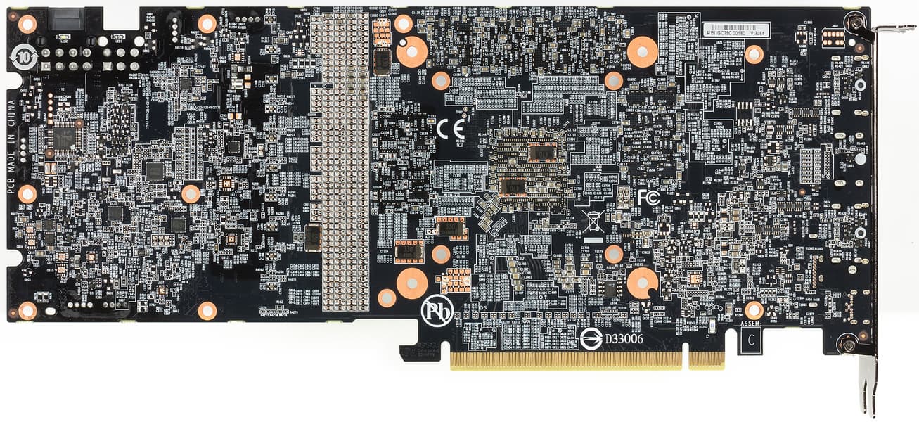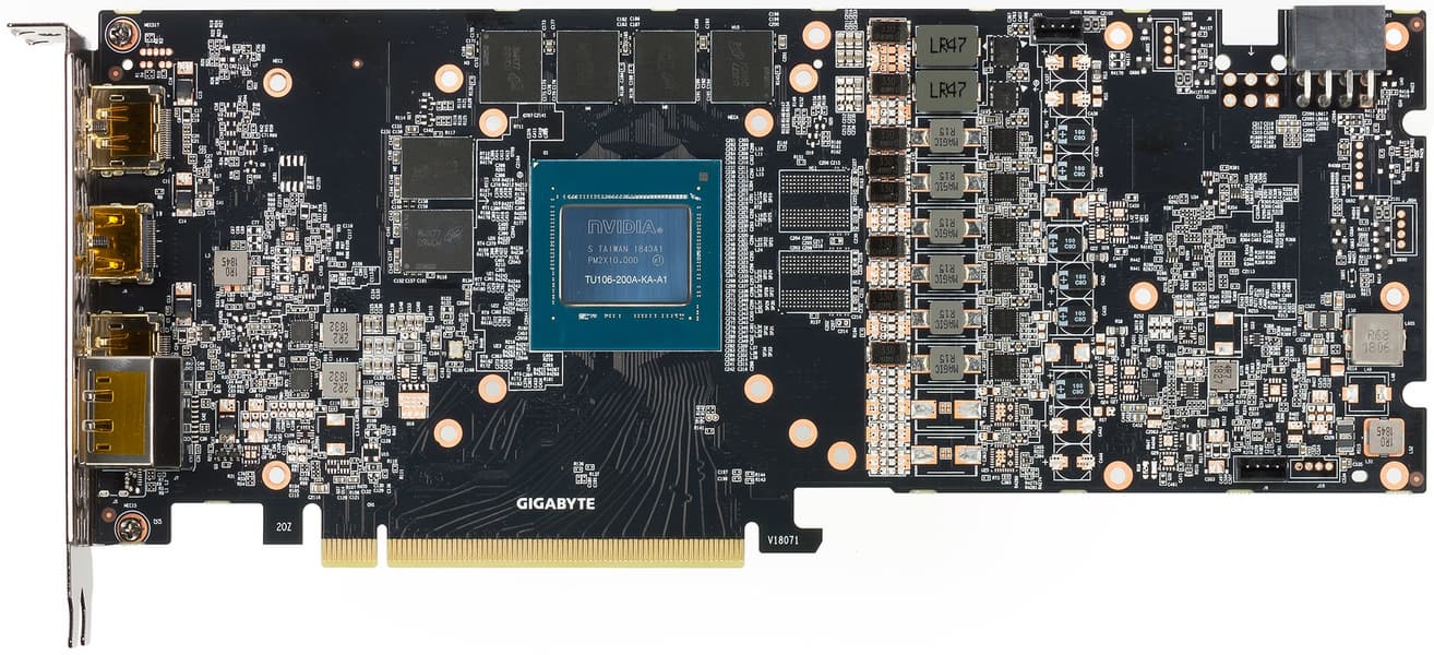 Очевидно, что печатная плата у карты Gigabyte кардинально отличается от референс-дизайна (сохранены лишь расположения GPU и микросхем памяти). Если инженеры Nvidia пошли по пути уменьшения площади «ненужного» текстолита, и даже разъем дополнительного питания вынесен на проводах (ибо длина СО больше длины печатной платы), то в Gigabyte решили поступить просто: взяли за основу плату от GeForce RTX 2070, поскольку GPU там тот же самый (отличается лишь количество отключенных блоков). Так что сегодня перед нами, по сути, GeForce RTX 2070 с некоторыми упрощениями: не распаяны несколько разведенных микросхем памяти, элементов преобразователя питания, собственно разъем питания (второй).