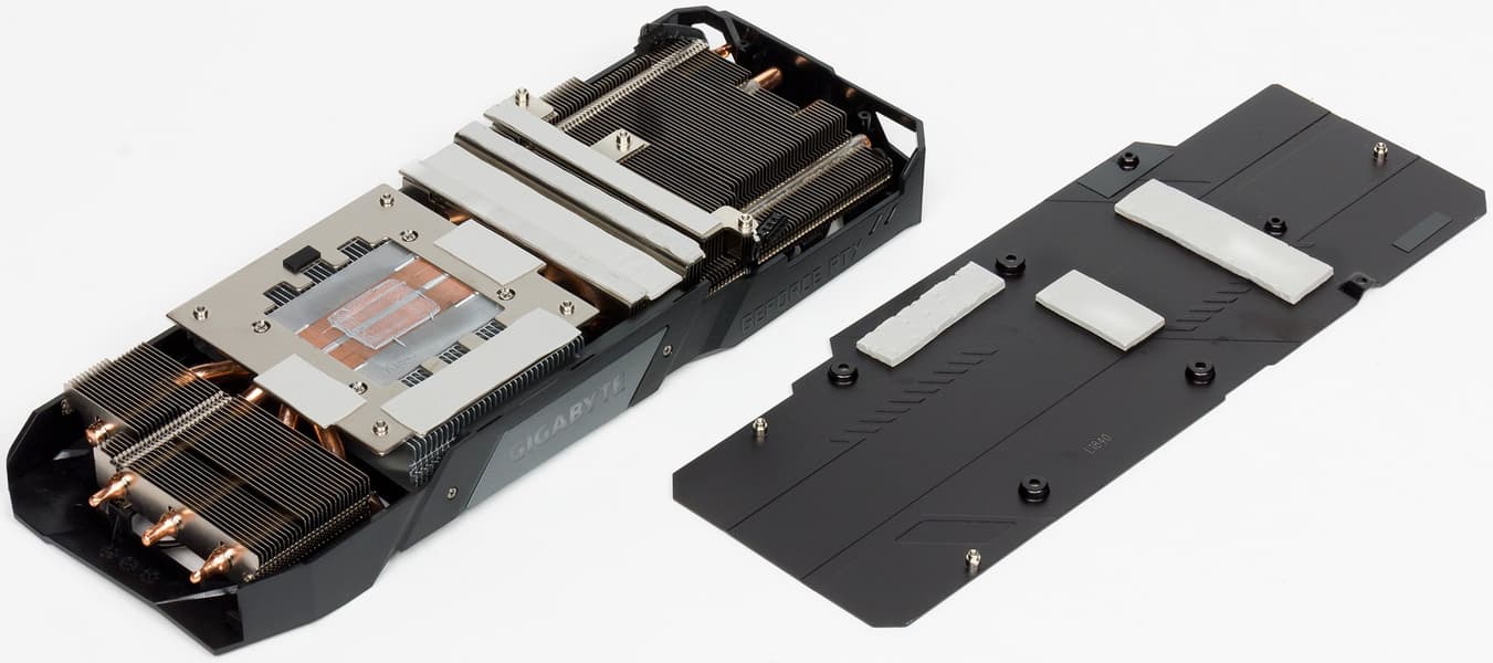 Перед нами уже, так сказать, традиционный двухсекционный радиатор пластинчатого типа, обе секции которого соединяются 4 тепловыми трубками, прижимающимися напрямую к микросхеме GPU. На той же подошве основного радиатора имеется и термоинтерфейс для охлаждения микросхем памяти. К силовым элементам конвертера питания прижимается подошва на второй части радиатора. На обороте карты установлена толстая пластина, служащая не только элементом жесткости, но и охладителем PCB.