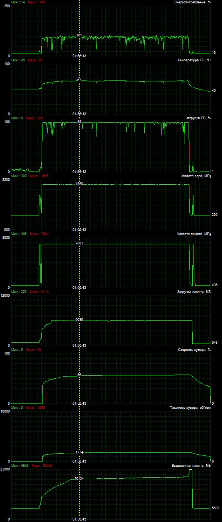После 6-часового прогона под нагрузкой максимальная температура ядра не превысила 65 градусов, что является прекрасным результатом для видеокарты такого уровня.
