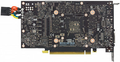 Поверх радиатора установлен кожух с тремя вентиляторами со специальным профилем лопастей, который, по идее, помогает снизить шум. По сути, используется СО от RTX 2070, поэтому карта занимает 2 слота в системном блоке.