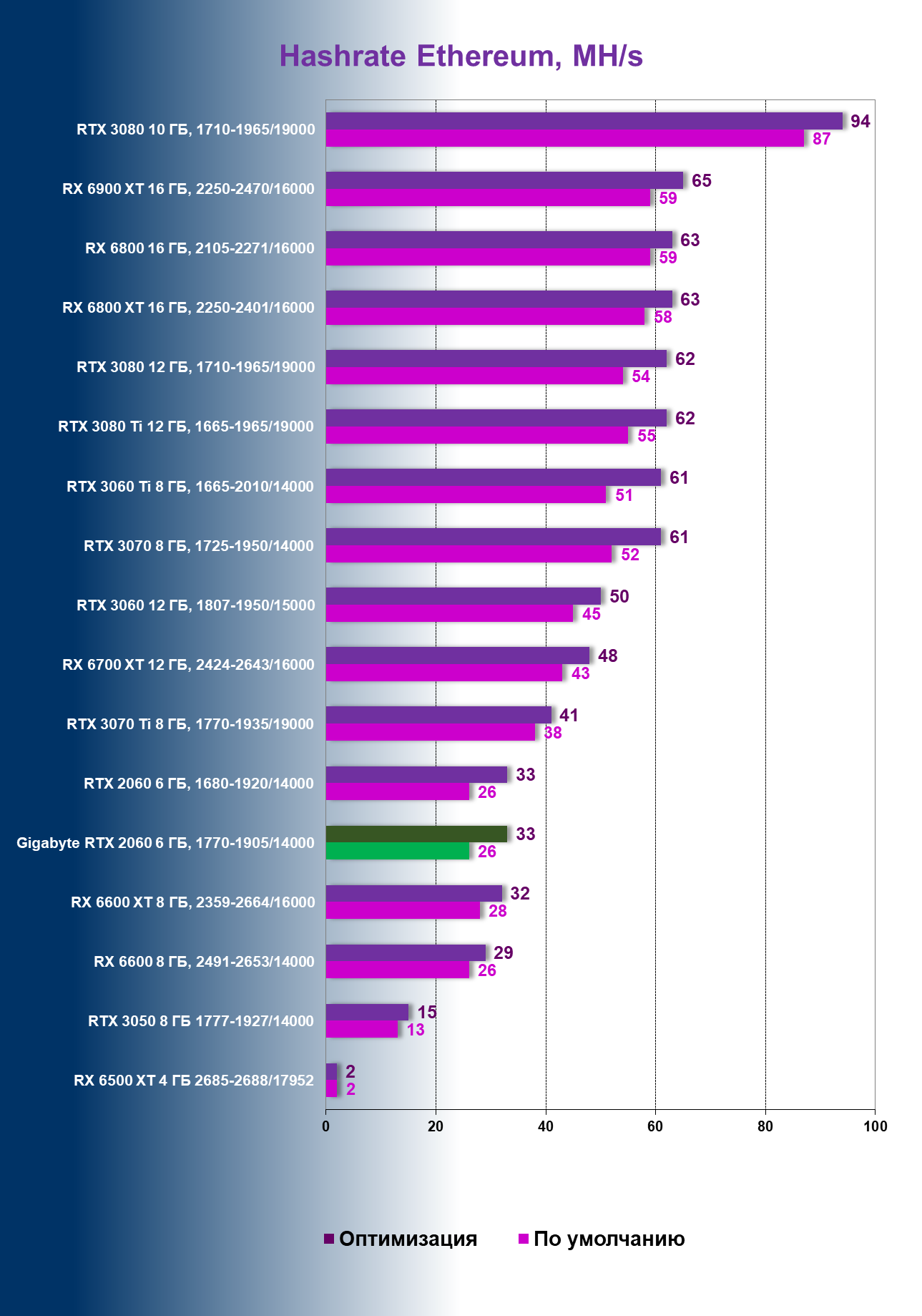 | Без оптимизации | 26 MH/s | 13 MH/s |