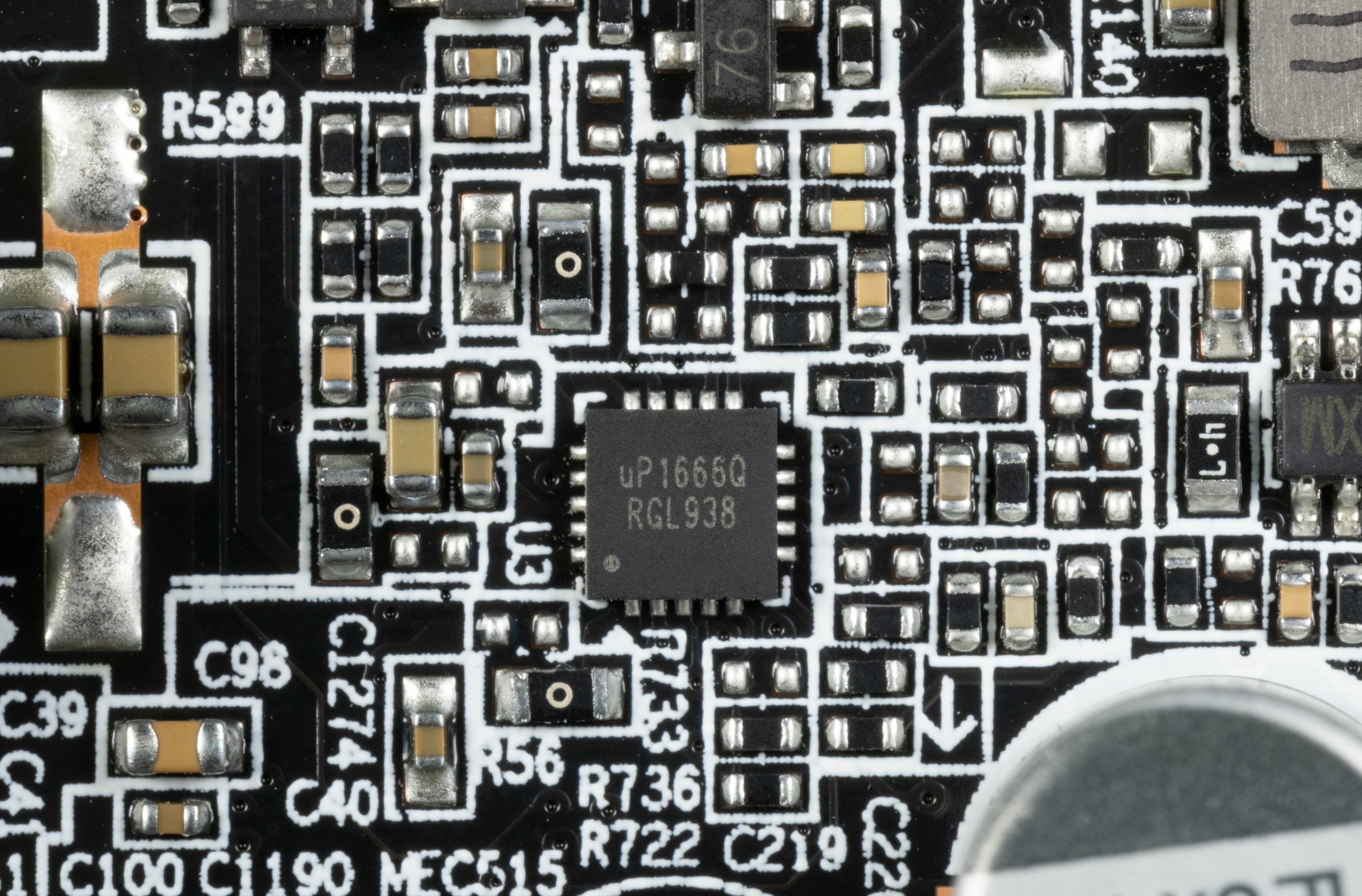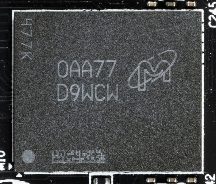 ШИМ-контроллер uP1666Q (uPI Semiconductor) контролирует две фазы питания 6 микросхем памяти. Контроллер расположен на тыльной стороне платы.