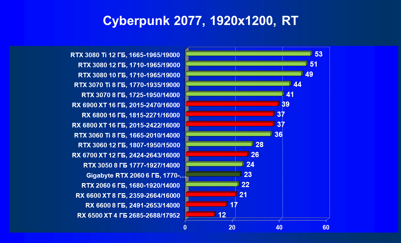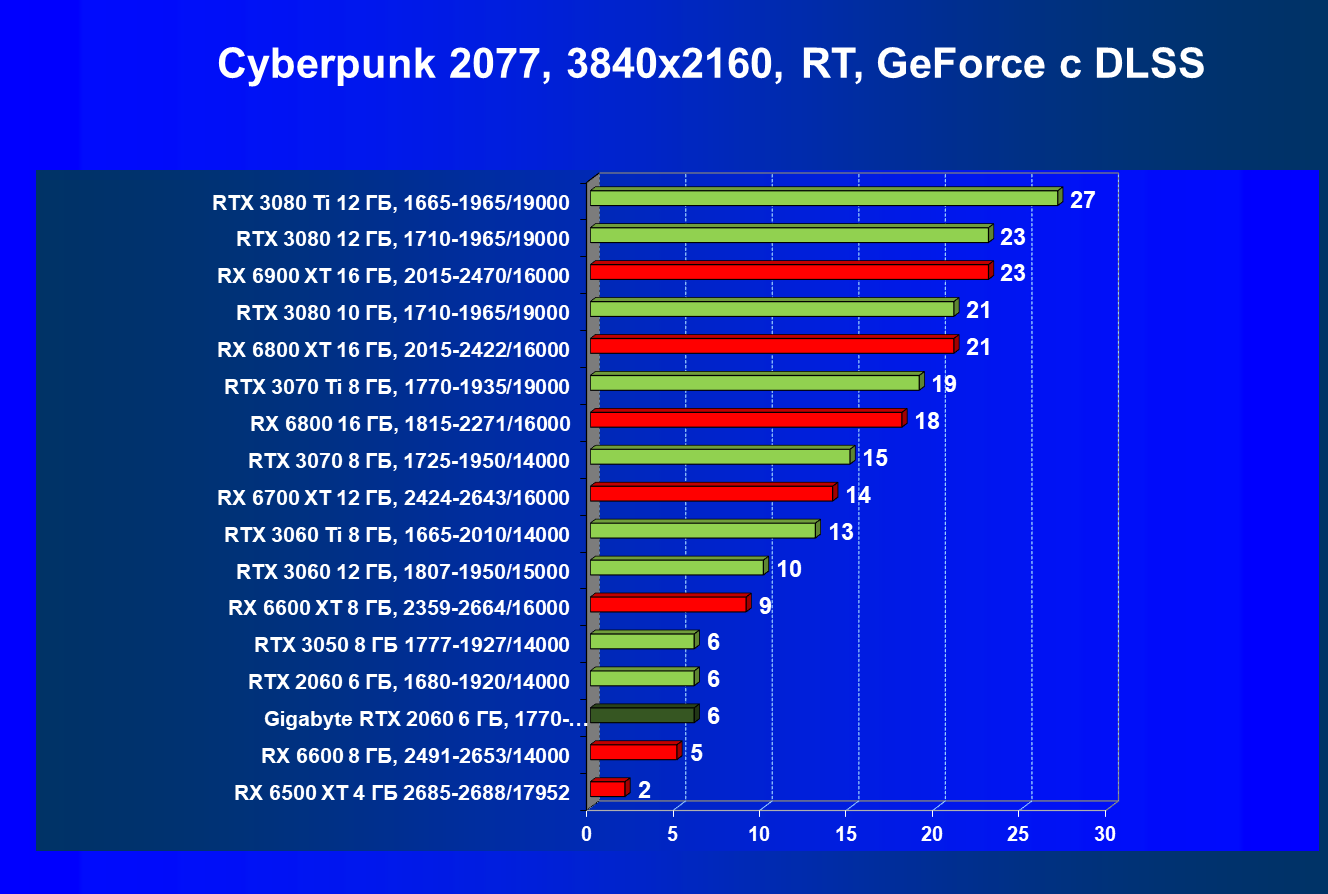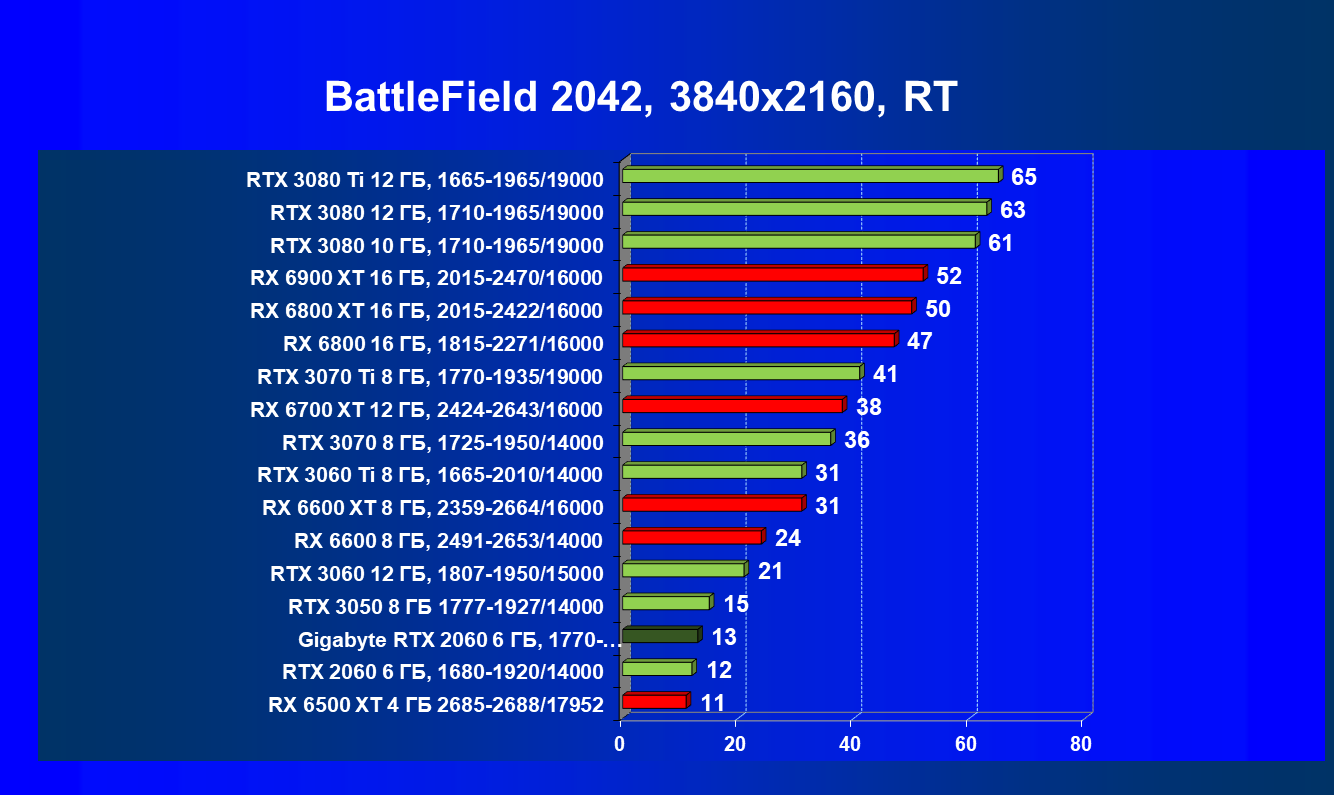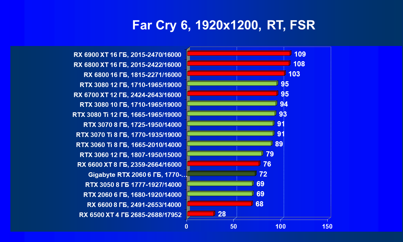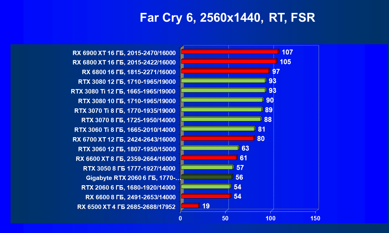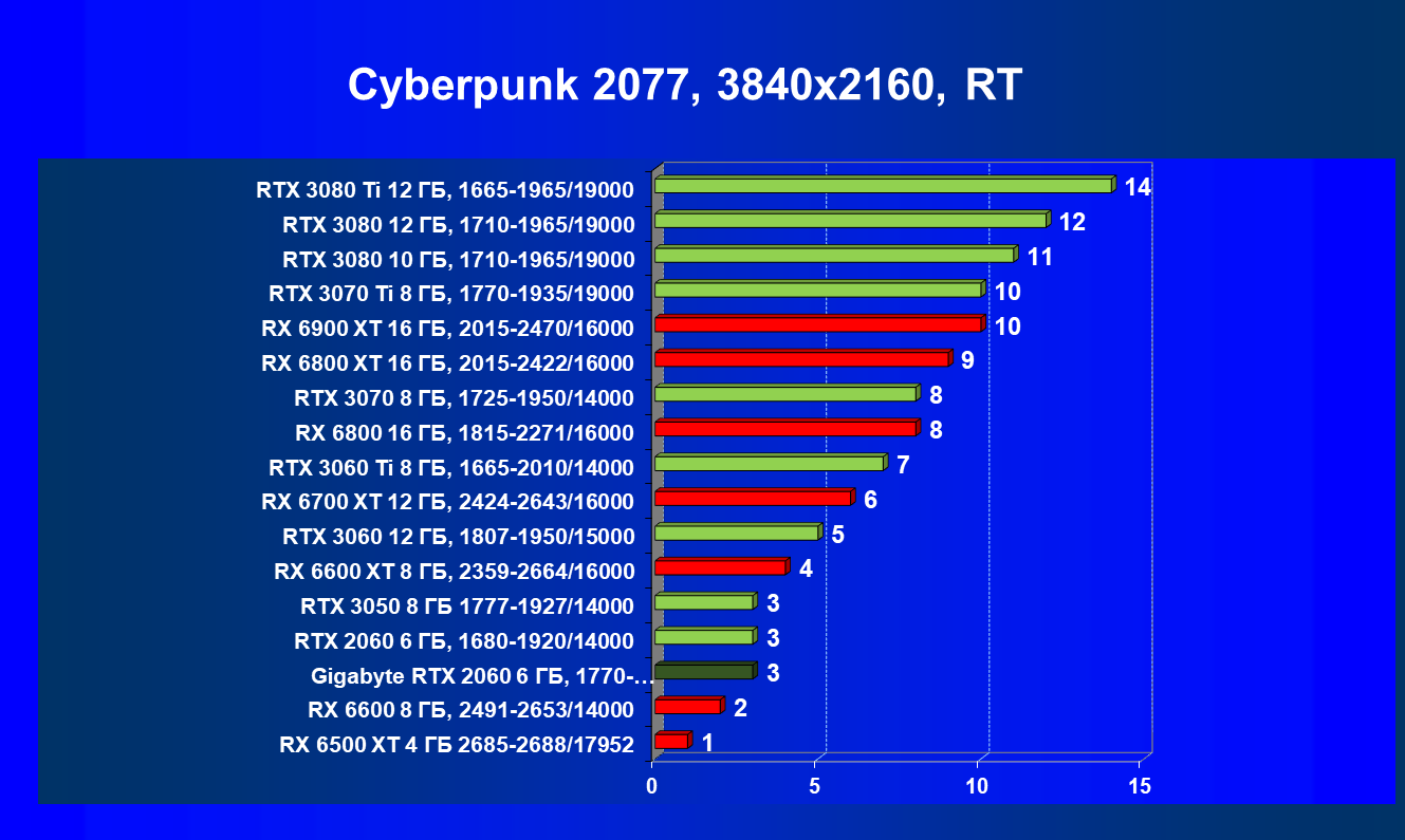 | 13 | RX 6600 (8 ГБ), 2491—2653/14000 | 180 | 31 | 59 000 |