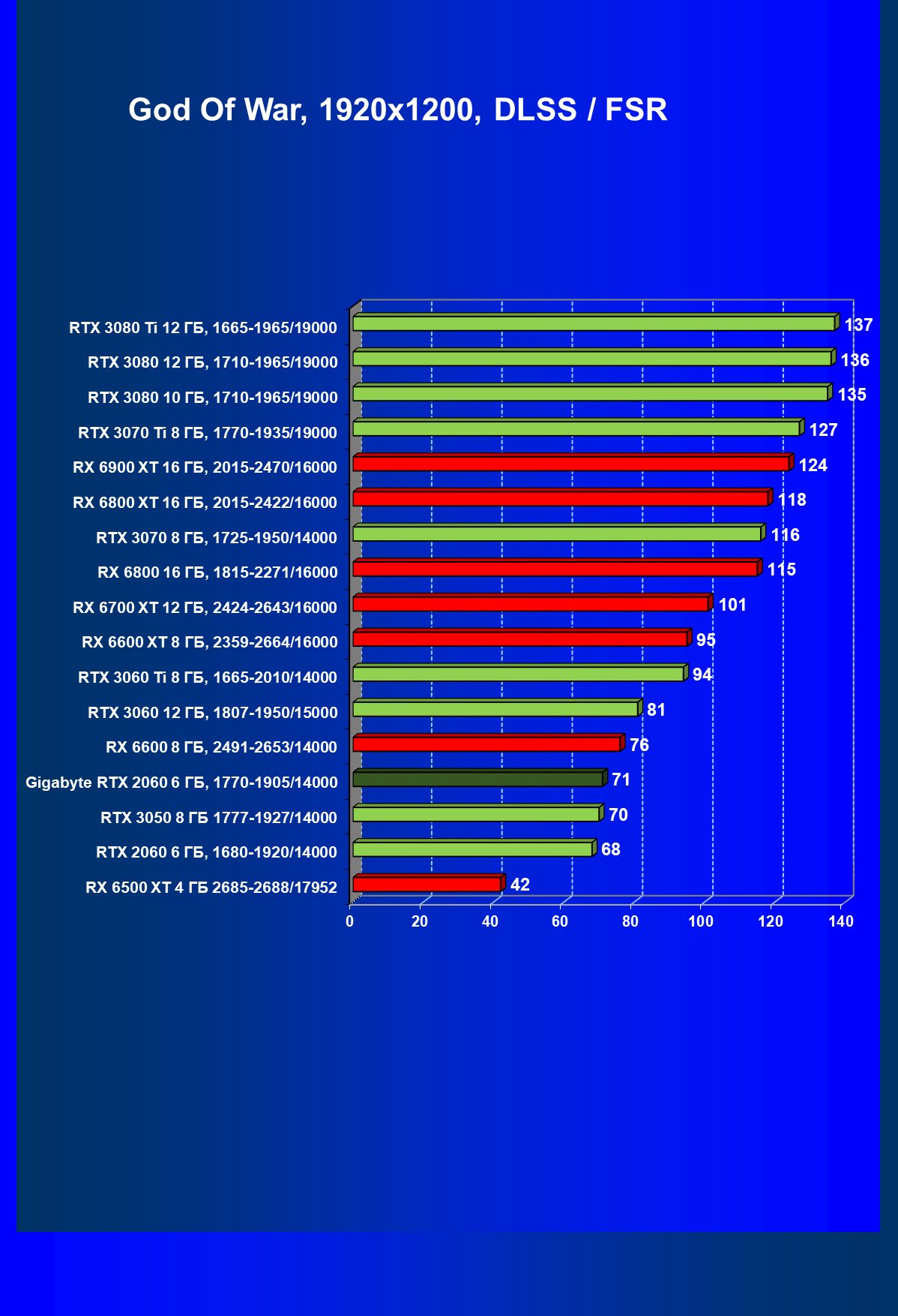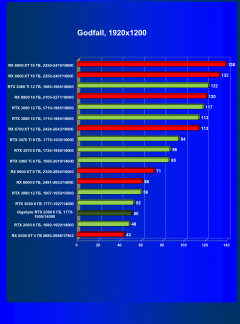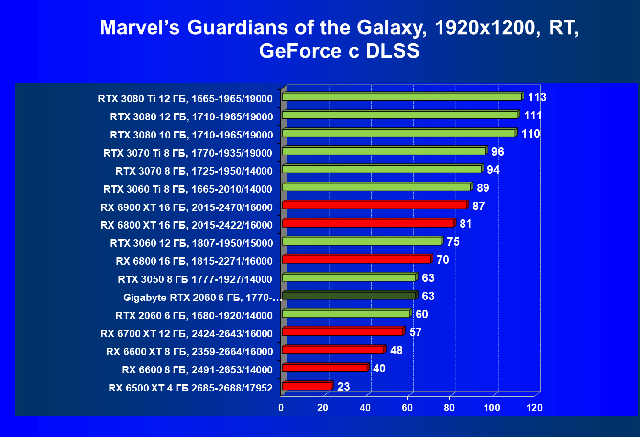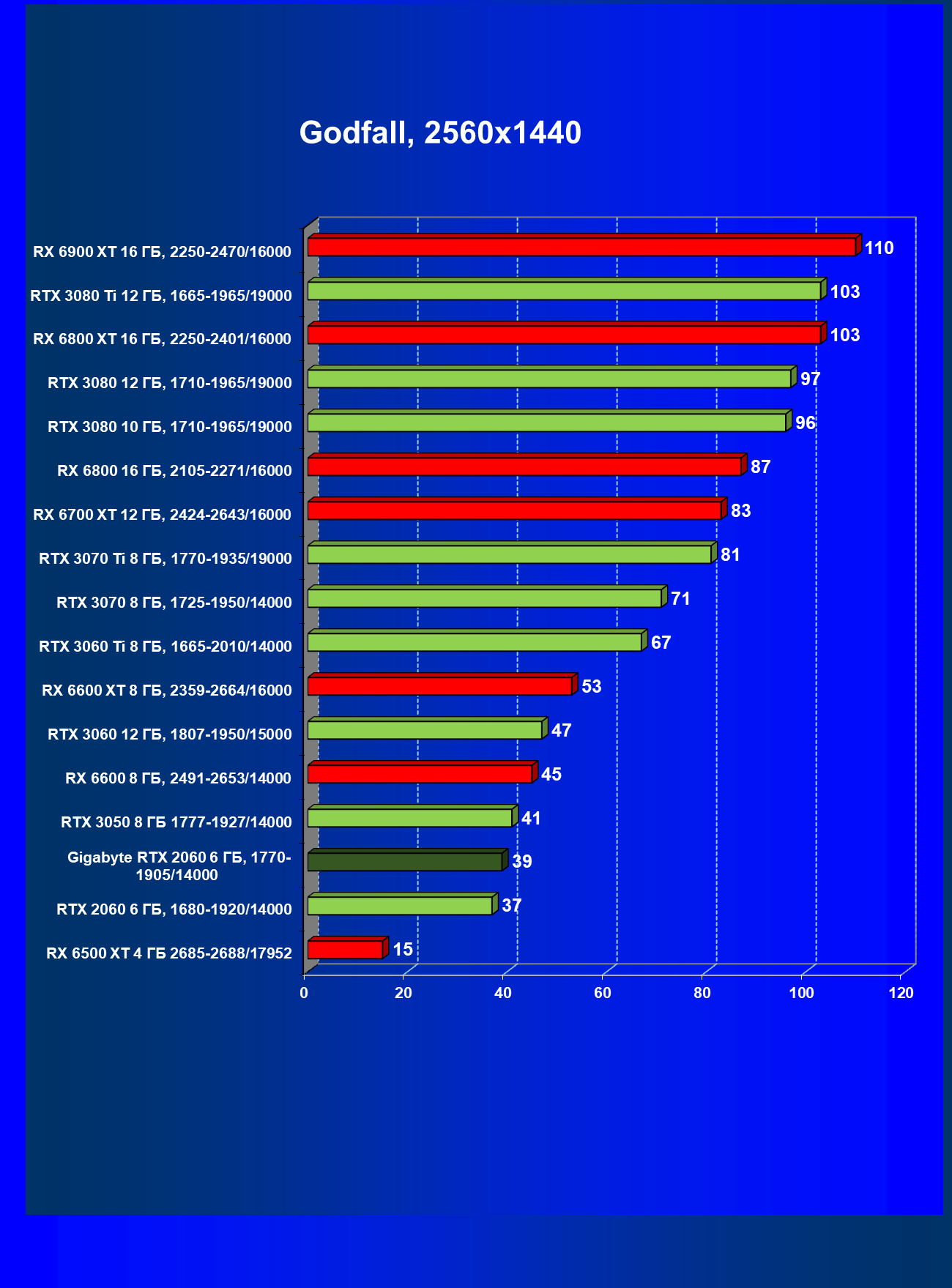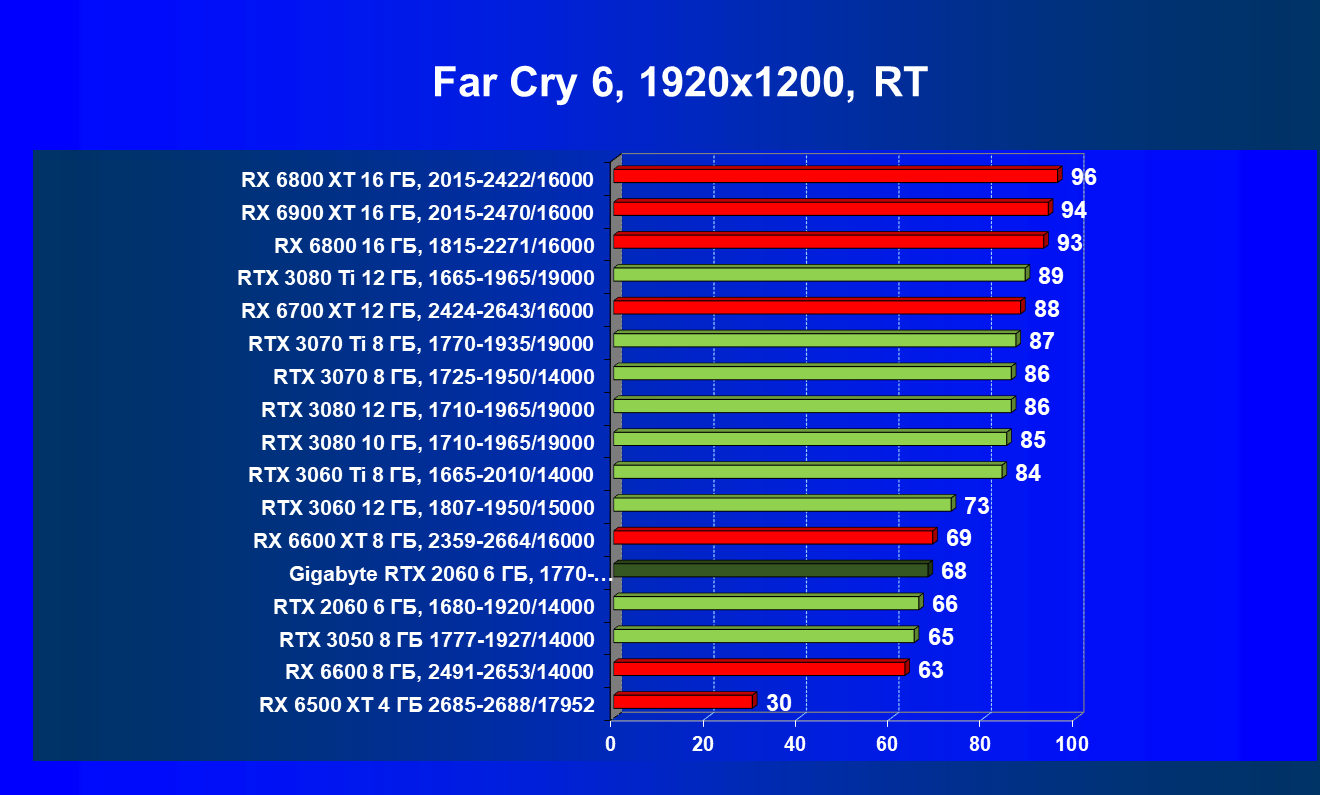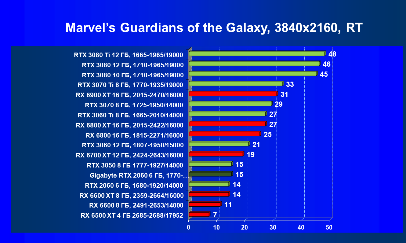 | 13 | RX 6600 (8 ГБ), 2491—2653/14000 | 180 | 31 | 59 000 |