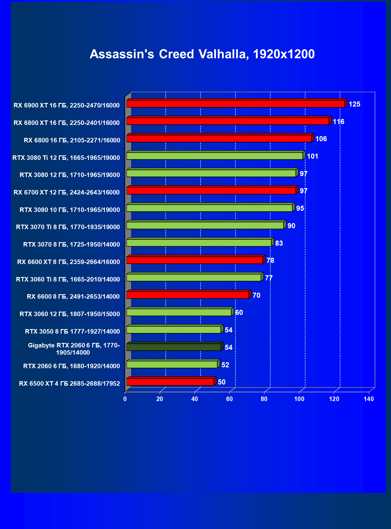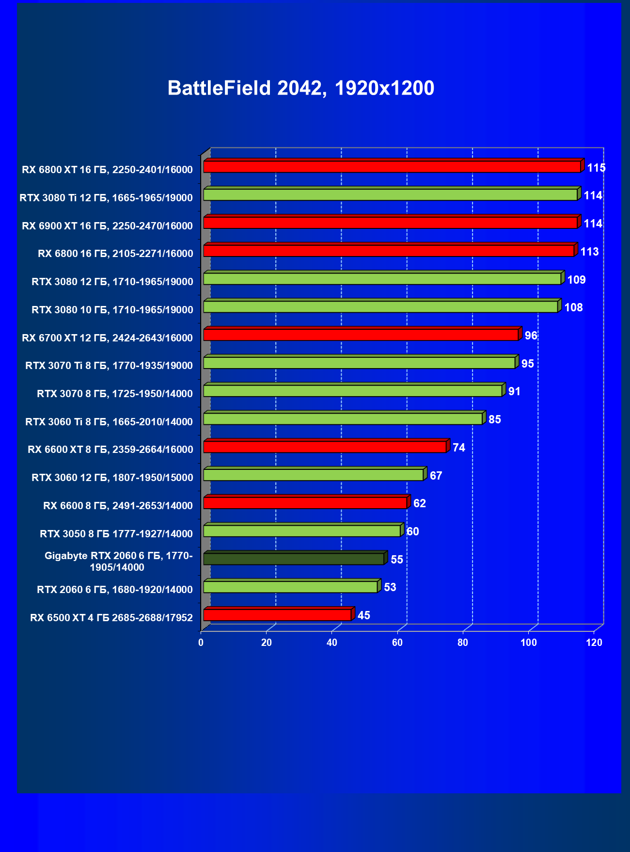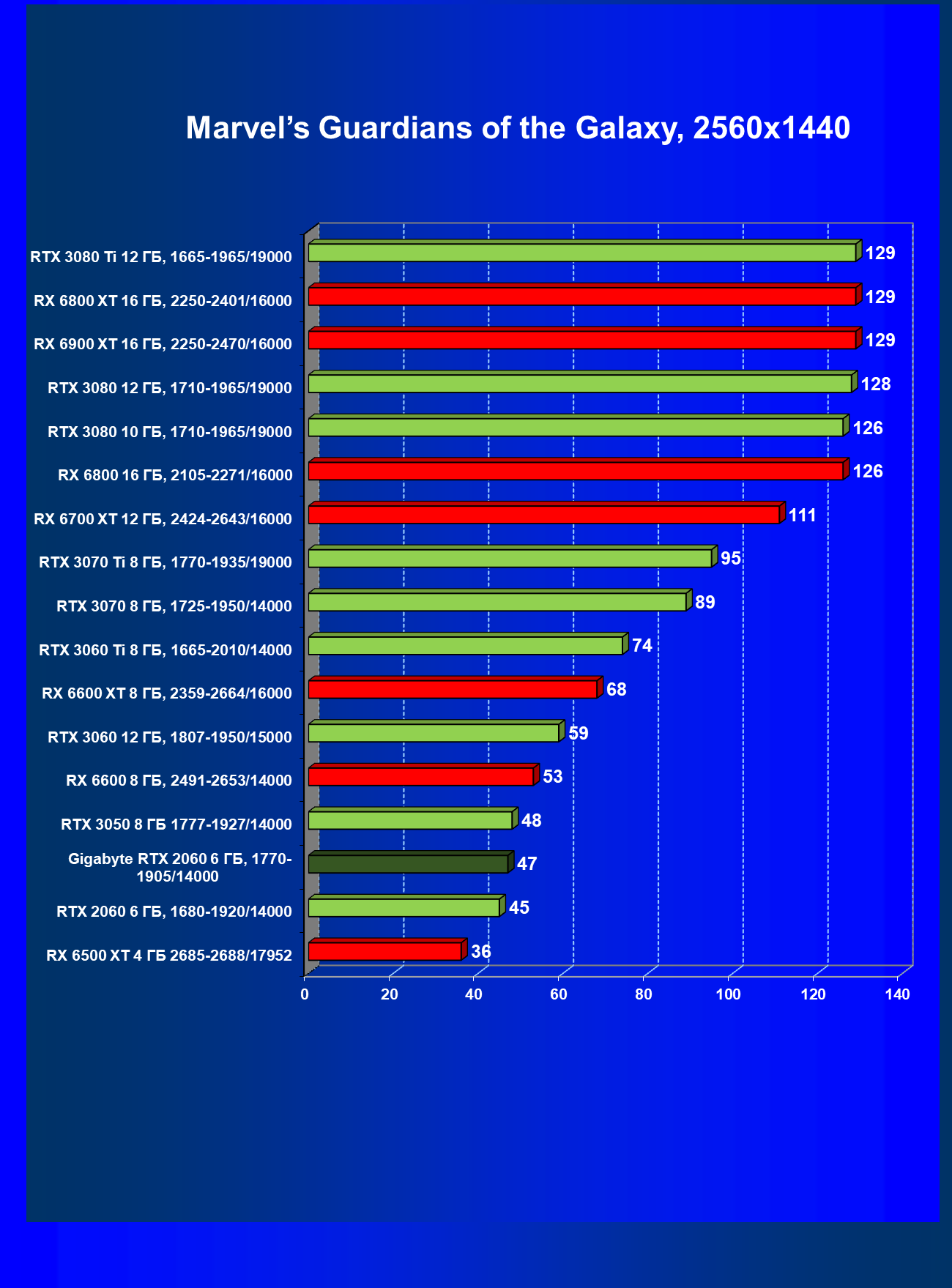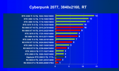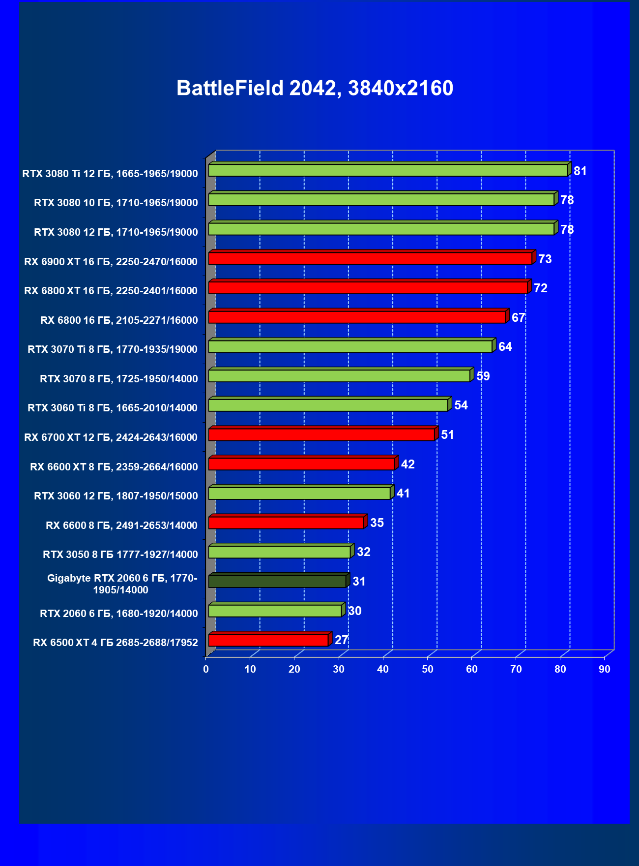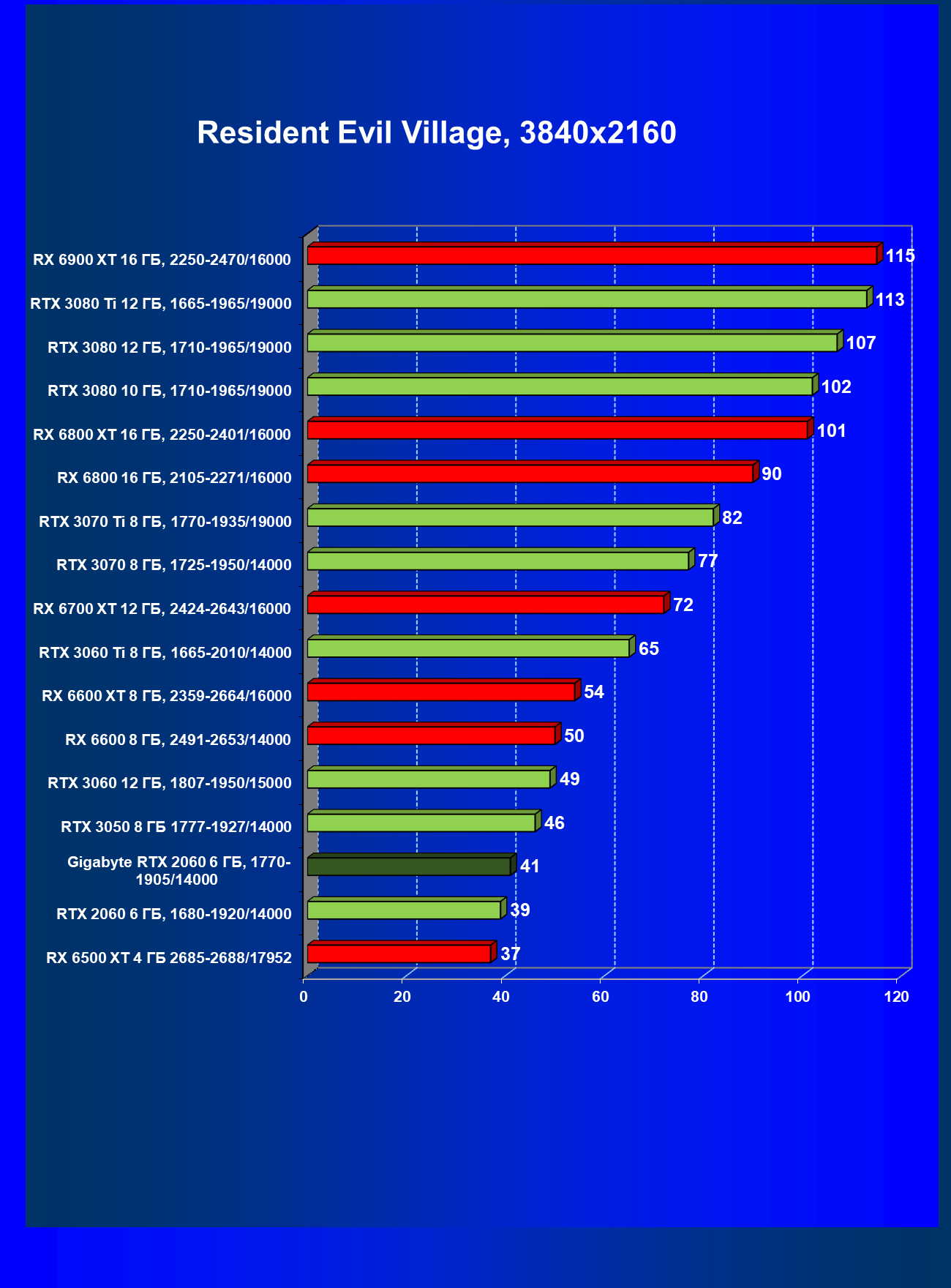 | 13 | RX 6600 (8 ГБ), 2491—2653/14000 | 180 | 31 | 59 000 |