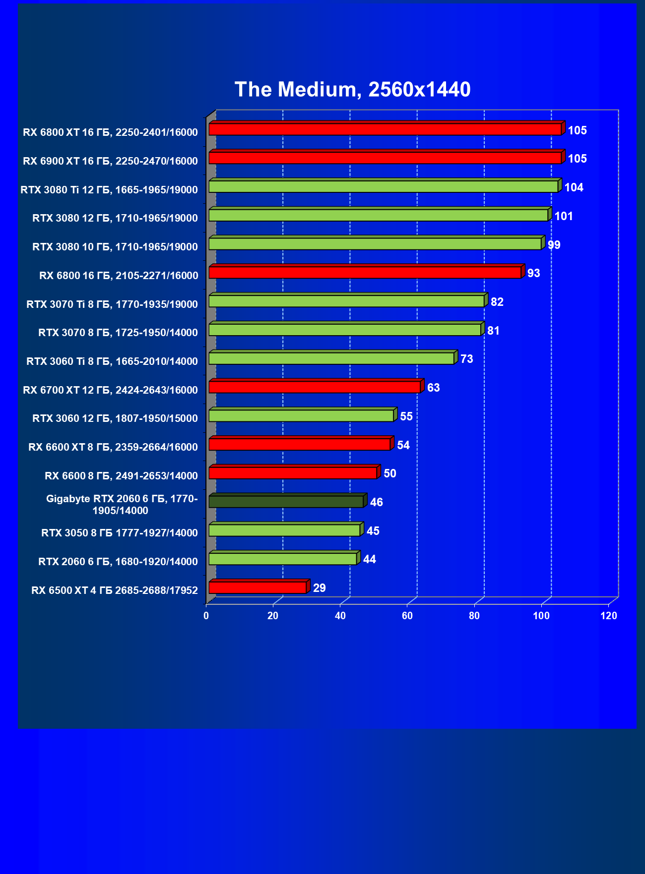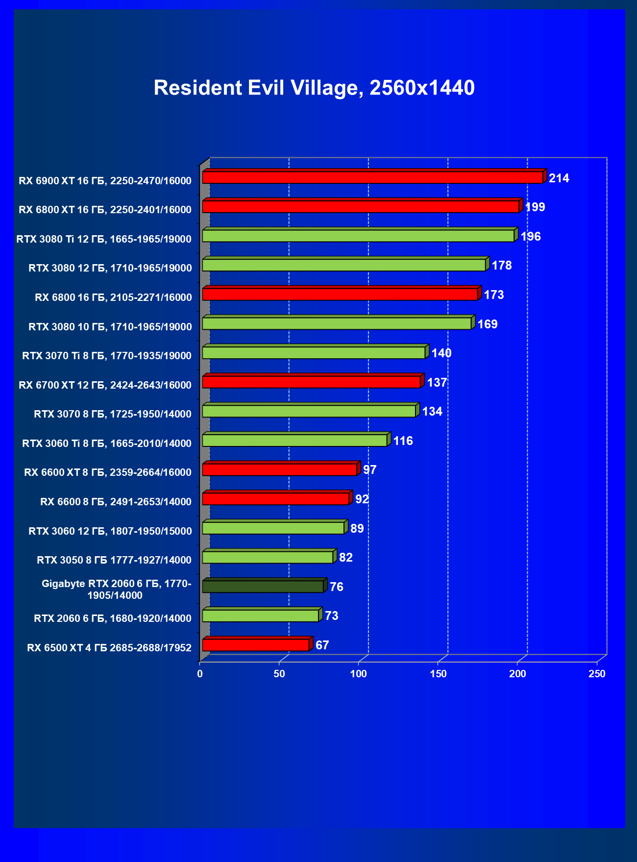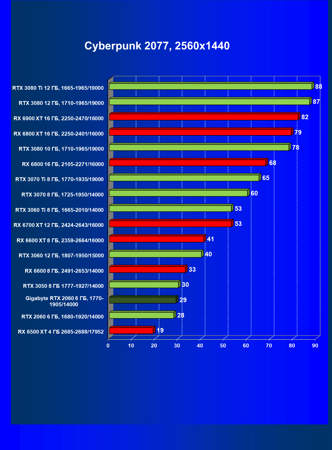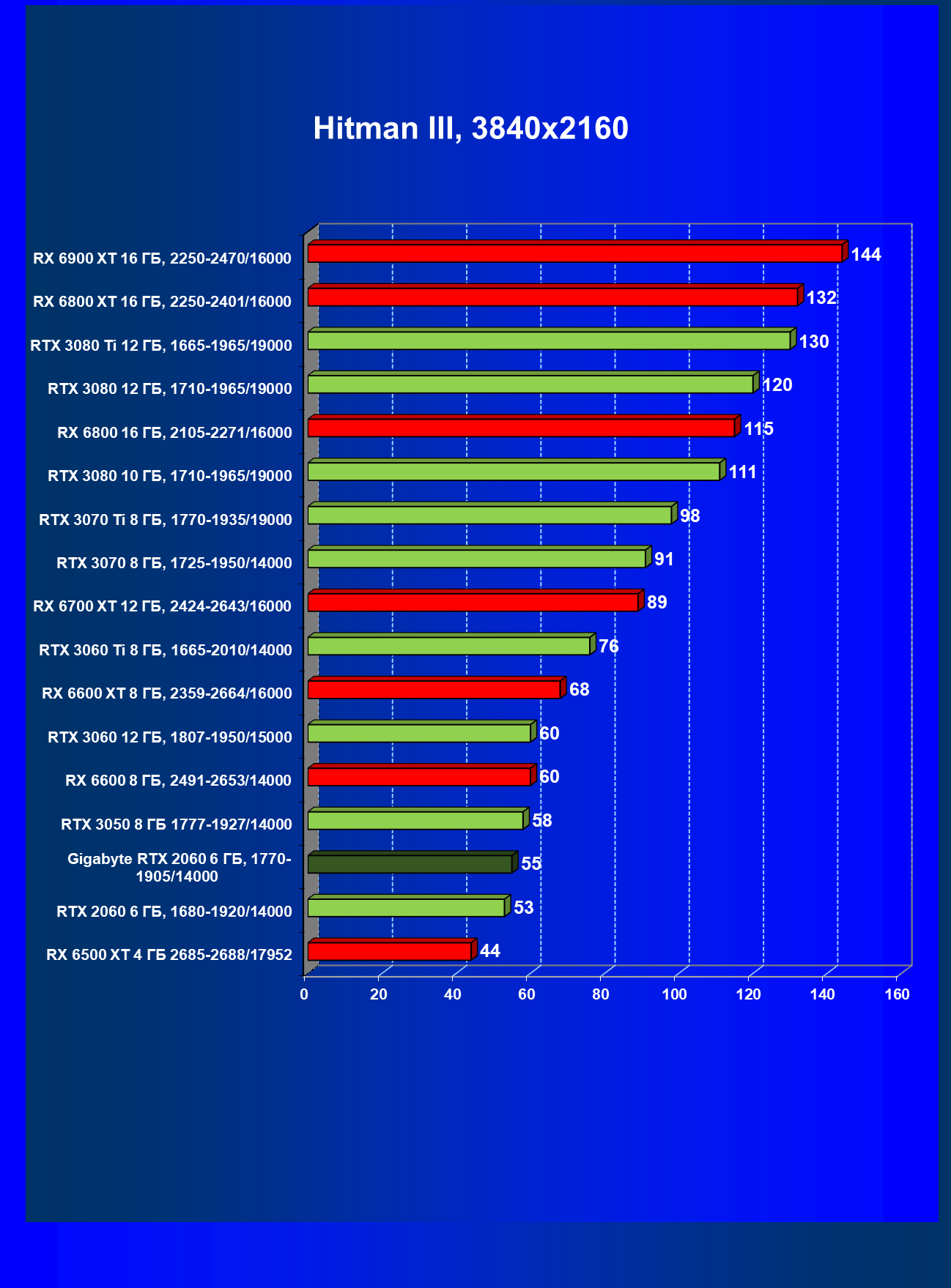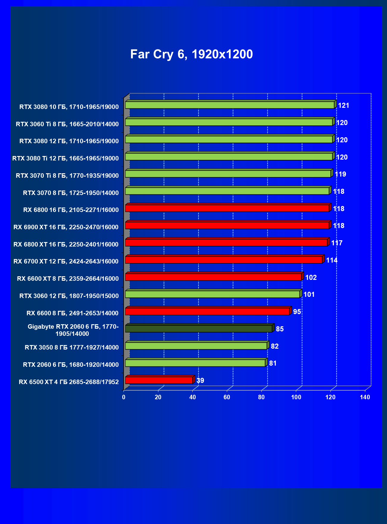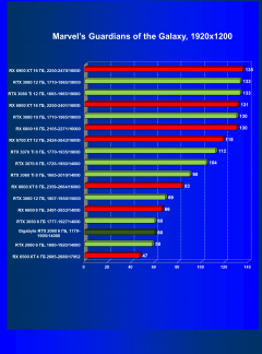 | 13 | RX 6600 (8 ГБ), 2491—2653/14000 | 180 | 31 | 59 000 |