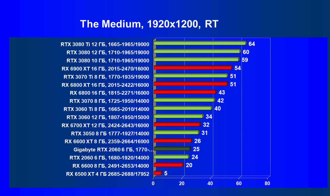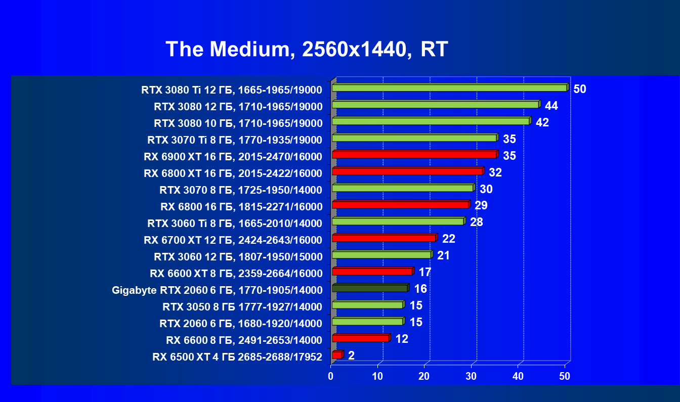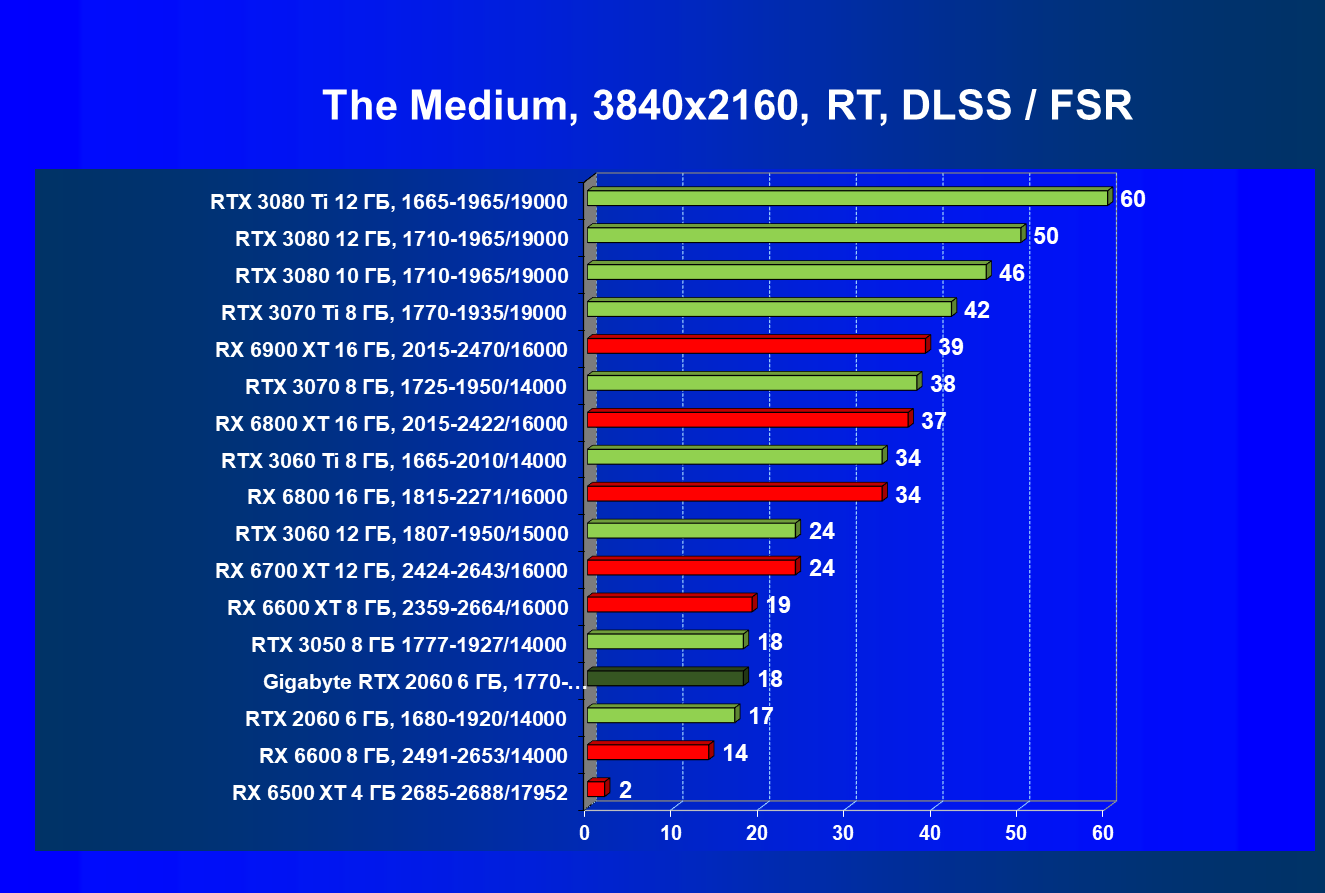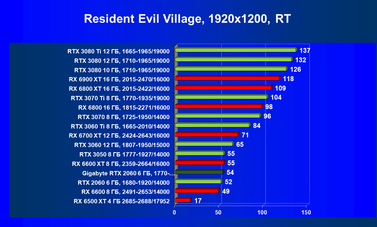Хотя ускоритель GeForce RTX 2060 вышел в начале 2019 года, он по-прежнему сохраняет актуальность. В разрешении Full HD даже на ультра-настройках графики производительность приемлемая, обеспечивается возможность играть с трассировкой лучей и DLSS. Производительность в играх с трассировкой лучей у GeForce RTX 3050 и GeForce RTX 2060 довольно близка, однако на момент подготовки обзора приобрести GeForce RTX 3050 уже можно было чуть дешевле. А вот у Radeon RX 6500 XT включать трассировку лучей не рекомендуется, потому что провал в производительности огромный, даже несмотря на частичную компенсацию за счет FSR. Даже модель Radeon RX 6600, без включения RT более производительная, чем GeForce RTX 2060/3050, с трассировкой лучей уступает им.